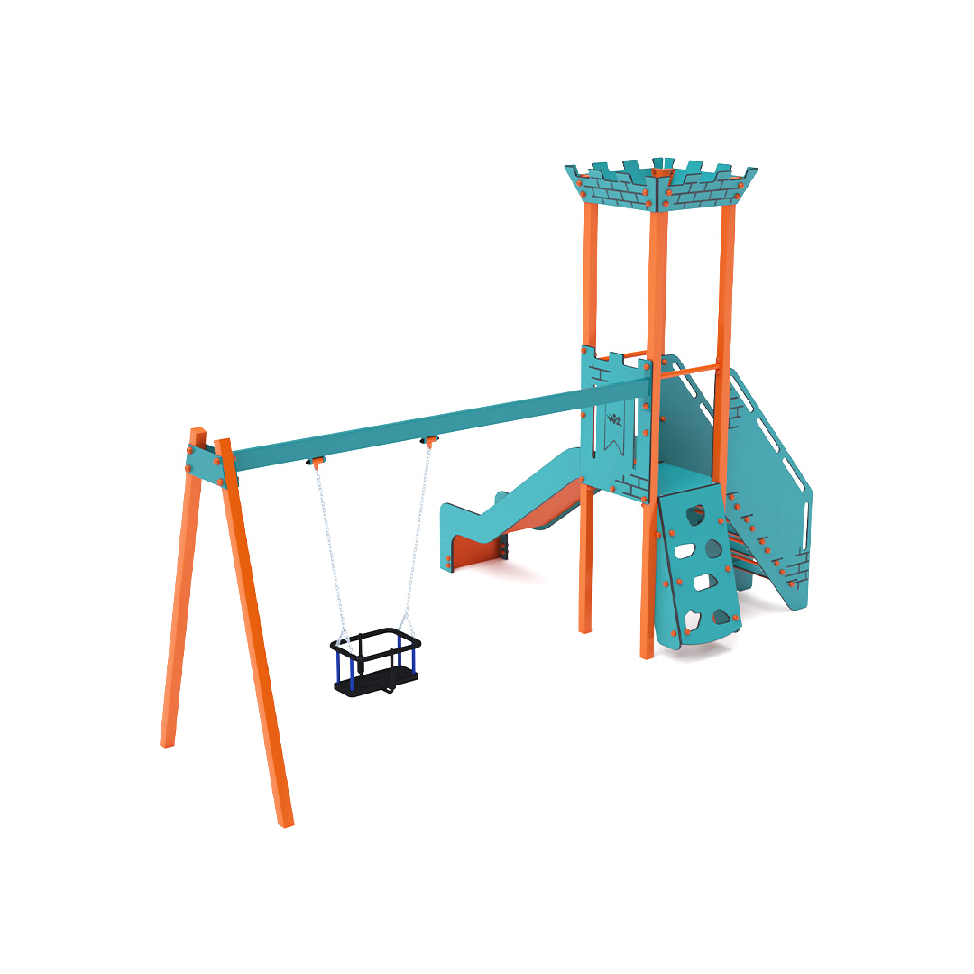 A lengőhintával kibővített egytornyú mini játszóvár tartó szerkezete horganyzott és porszórt acélból, padlója, ferde mászófala, lépcsője, koronája és a mellvéd HPL jelölésű magas nyomású laminált kompaktlemezből, csúszdája pedig HDPE műanyag és HPL kompaktlemez kombinációjából készül. A magas nyomású HPL lemez törhetetlen, nem mérgező, újrahasznosítható, továbbá vegyszer- és UV álló. A HDPE jelölésű, nagy sűrűségű polietilén lapokat főként magas szilárdságuk, szívósságuk és nedvességállóságuk jellemzik. Minden kötőelem rozsdamentes acélból készül és a fokozott tartósság és biztonság érdekében műanyag kupakkal van lezárva. A használt anyagoknak köszönhetően az eszköz minimális karbantartást igényel! A játékeszközt úgy terveztük, hogy a hosszú élettartam mellett a maximális biztonságot is garantálja!