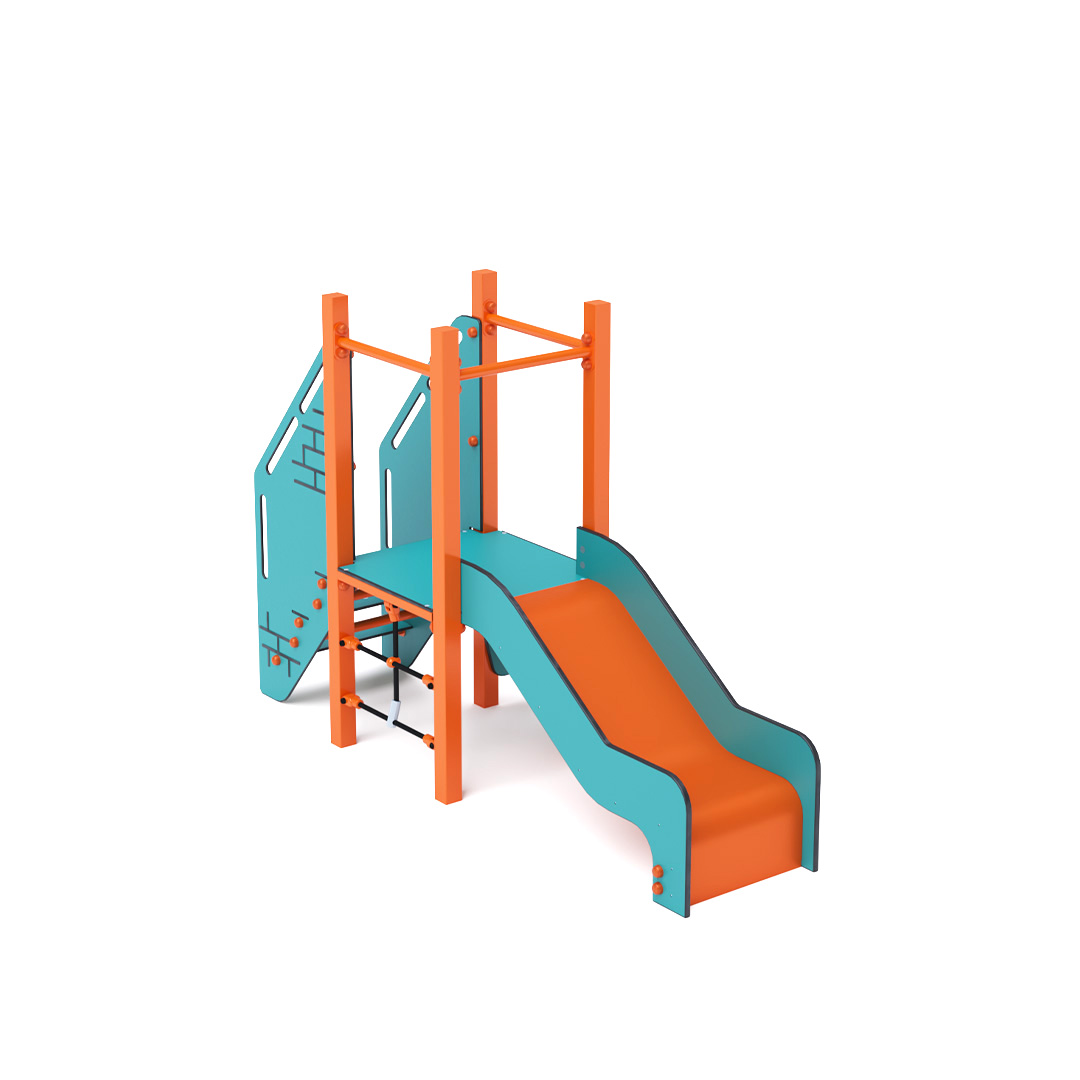 Az egytornyú mini játszóvár tartó szerkezete horganyzott és porszórt acélból, padlója, ferde mászófala és lépcsője HPL jelölésű magas nyomású laminált kompaktlemezből, kötélrendszere acélmagos poliészter kötélből, csúszdája pedig HDPE műanyag és HPL kompaktlemez kombinációjából készül. A magas nyomású HPL lemez törhetetlen, nem mérgező, újrahasznosítható, továbbá vegyszer- és UV álló. A poliészter szálakból készült acélmagos kötél magas szilárdsággal bír és ezáltal jobban ellenáll a mechanikai igénybevételnek. Maga a poliészter számos pozitív tulajdonsággal rendelkezik. Színtartó, ellenáll a mikroorganizmusoknak, az időjárási hatásoknak, (pl. eső után gyorsan szárad). A HDPE jelölésű, nagy sűrűségű polietilén lapokat főként magas szilárdságuk, szívósságuk és nedvességállóságuk jellemzik. Minden kötőelem rozsdamentes acélból készül és a fokozott tartósság és biztonság érdekében műanyag kupakkal van lezárva. A használt anyagoknak köszönhetően az eszköz minimális karbantartást igényel! A játékeszközt úgy terveztük, hogy a hosszú élettartam mellett a maximális biztonságot is garantálja!
