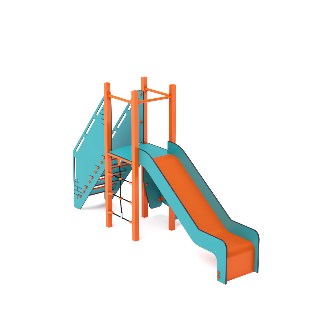 Az egytornyú mini játszóvár tartó szerkezete horganyzott és porszórt acélból, padlója, ferde mászófala és lépcsője HPL jelölésű magas nyomású laminált kompaktlemezből, kötélrendszere acélmagos poliészter kötélből, csúszdája pedig HDPE műanyag és HPL kompaktlemez kombinációjából készül. A magas nyomású HPL lemez törhetetlen, nem mérgező, újrahasznosítható, továbbá vegyszer- és UV álló. A poliészter szálakból készült acélmagos kötél magas szilárdsággal bír és ezáltal jobban ellenáll a mechanikai igénybevételnek. Maga a poliészter számos pozitív tulajdonsággal rendelkezik. Színtartó, ellenáll a mikroorganizmusoknak, az időjárási hatásoknak, (pl. eső után gyorsan szárad). A HDPE jelölésű, nagy sűrűségű polietilén lapokat főként magas szilárdságuk, szívósságuk és nedvességállóságuk jellemzik. Minden kötőelem rozsdamentes acélból készül és a fokozott tartósság és biztonság érdekében műanyag kupakkal van lezárva. A használt anyagoknak köszönhetően az eszköz minimális karbantartást igényel! A játékeszközt úgy terveztük, hogy a hosszú élettartam mellett a maximális biztonságot is garantálja!