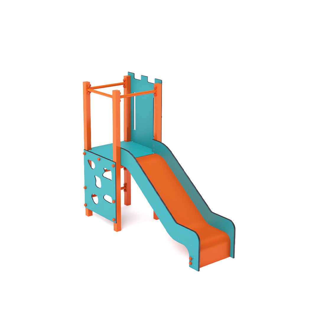 Az egytornyú mini játszóvár tartó szerkezete horganyzott és porszórt acélból, padlója, függőleges mászófala és a mellvéd HPL jelölésű magas nyomású laminált kompaktlemezből, csúszdája pedig HDPE műanyag és HPL kompaktlemez kombinációjából készül. A magas nyomású HPL lemez törhetetlen, nem mérgező, újrahasznosítható, továbbá vegyszer- és UV álló. A HDPE jelölésű, nagy sűrűségű polietilén lapokat főként magas szilárdságuk, szívósságuk és nedvességállóságuk jellemzik. Minden kötőelem rozsdamentes acélból készül és a fokozott tartósság és biztonság érdekében műanyag kupakkal van lezárva. A használt anyagoknak köszönhetően az eszköz minimális karbantartást igényel! A játékeszközt úgy terveztük, hogy a hosszú élettartam mellett a maximális biztonságot is garantálja!