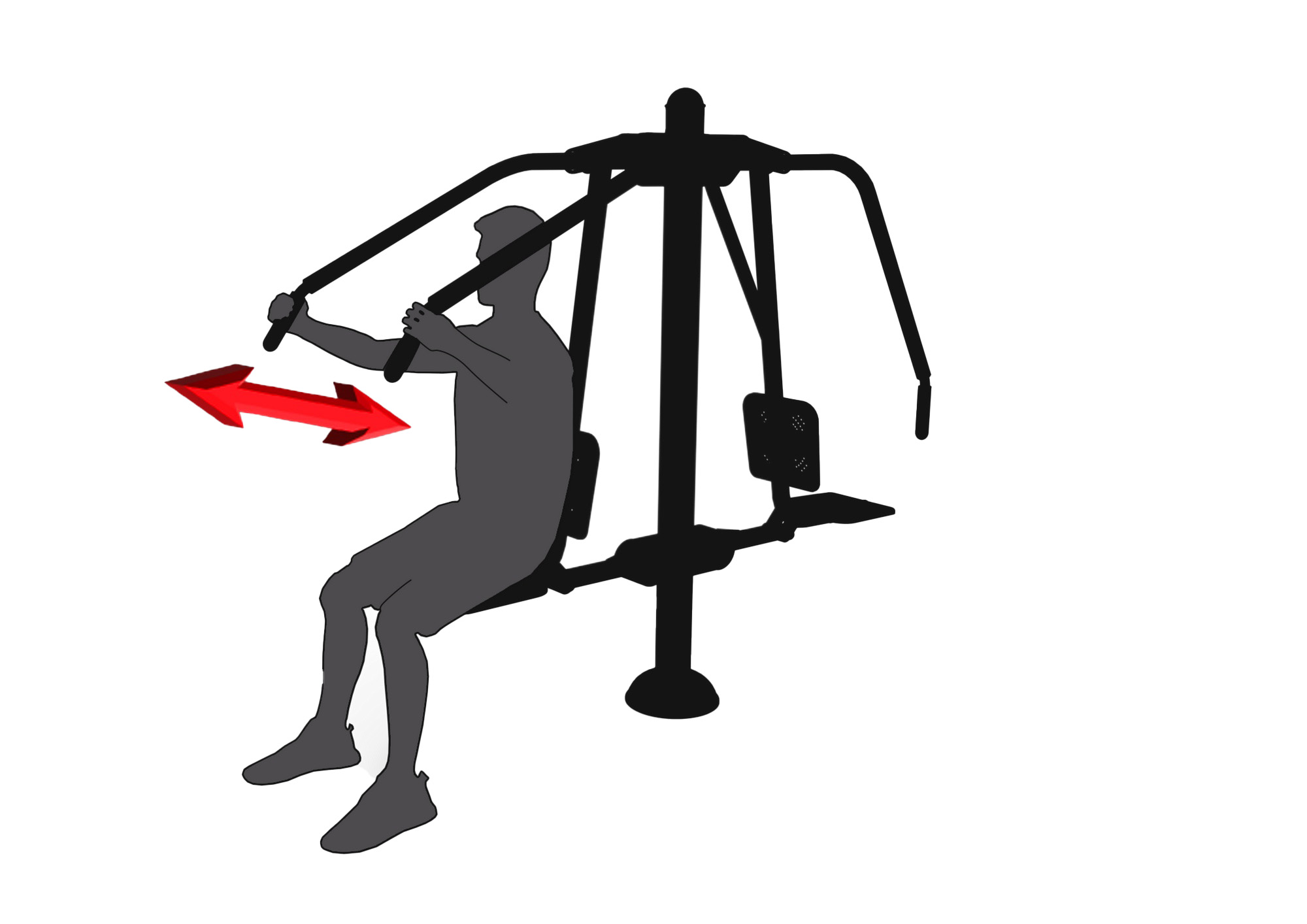 Mellnyomó gép - Az eszközön végzett edzés hozzájárul a mellkas és a felső végtagok erejének és izomtömegének növeléséhez. Hogyan kell edzeni - Üljön az ülésre egyenes háttal. Fogja meg mindkét fogantyút maga előtt, és tolja előre, amíg a karjai majdnem teljesen kinyújtottak és egyenesek nem lesznek. Lassan engedje vissza a kezét a kiinduló helyzetbe. Végezzen sima és kontrollált mozdulatokat. Fokozatosan növeld az ismétlések számát, ahogy az erőnléted javul.