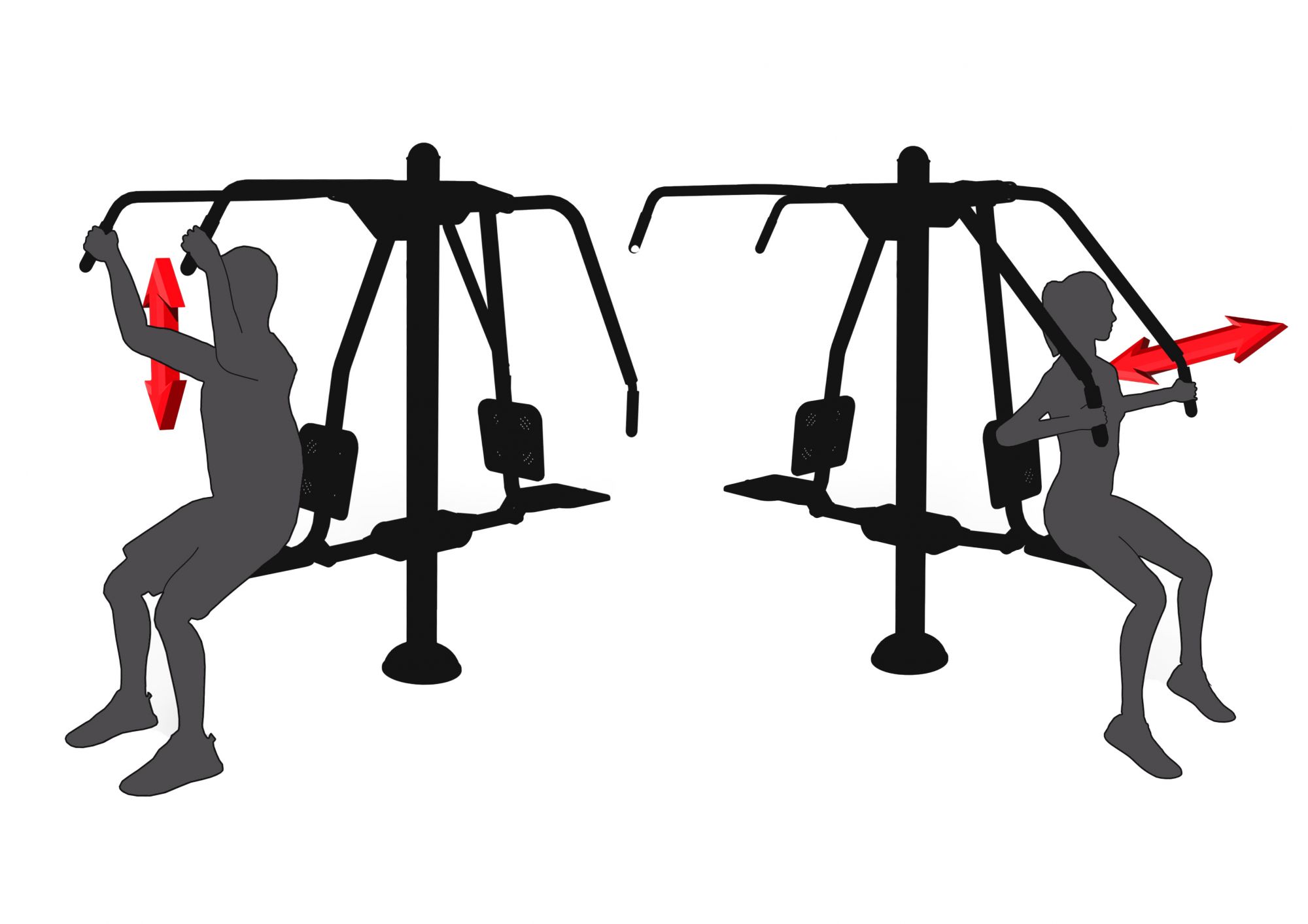 Hát: Üljön egyenesen, és fogja meg erősen a fogantyúkat. Lassan húzza le a karjait mellkasmagasságig, majd engedje vissza őket az eredeti helyzetbe. Belégzés közben húzza lefelé, kilégzés közben pedig felfelé. Nyomás: Üljön egyenesen, határozott háttal. Fogja meg a fogantyúkat, és nyomja előre, amíg a karjai majdnem teljesen ki nem nyúlnak és egyenesek nem lesznek. Lassan engedje vissza a karjait a kiinduló helyzetbe. Belégzés nyomás közben, kilégzés a kiinduló helyzetbe való visszatéréskor.