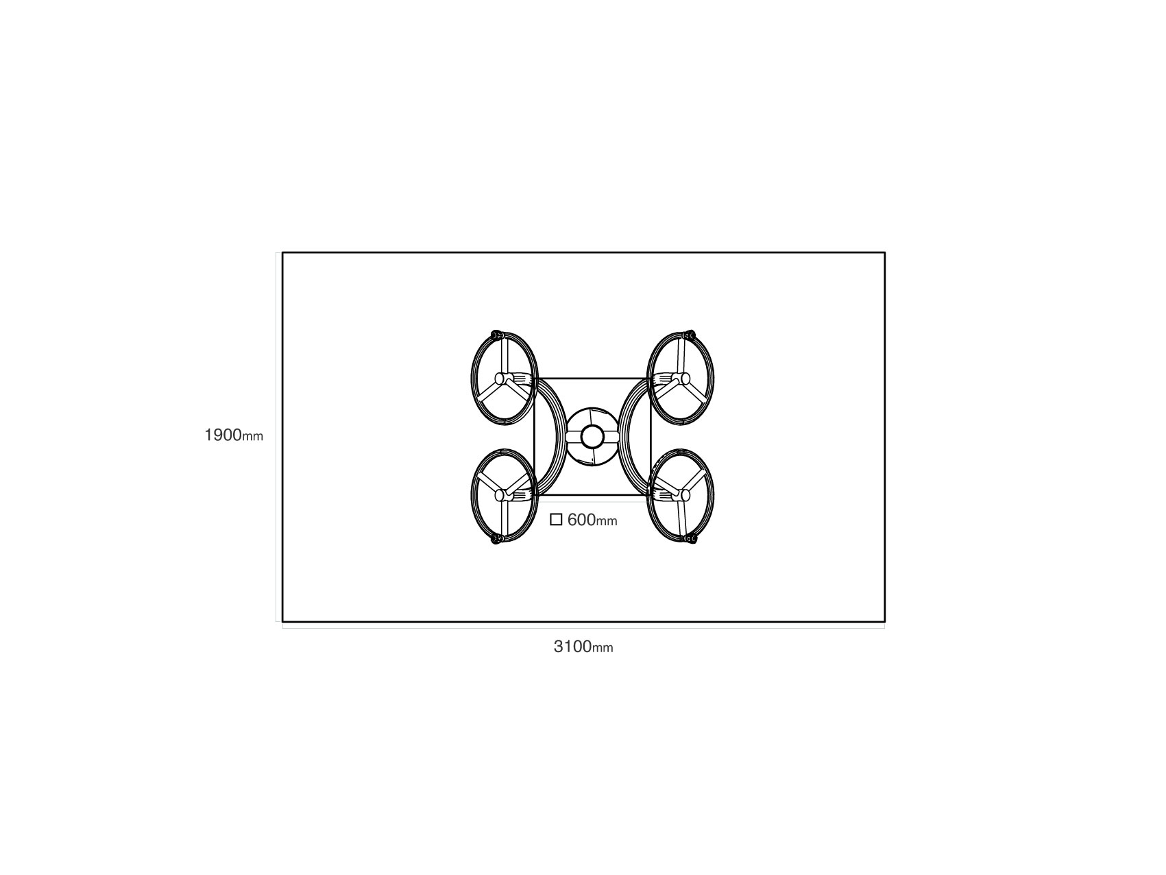Biztonsági zóna: 1,9 × 3,1 m