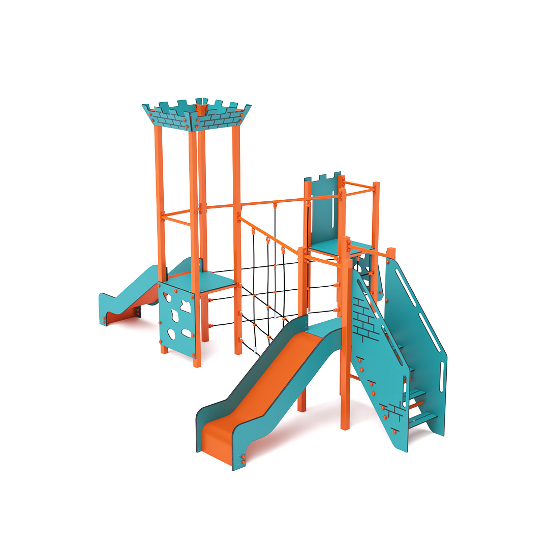 - lépcső, ferde mászófal, függőleges mászófal, függőleges létra, 2x csúszda, 3x függőleges kötélháló