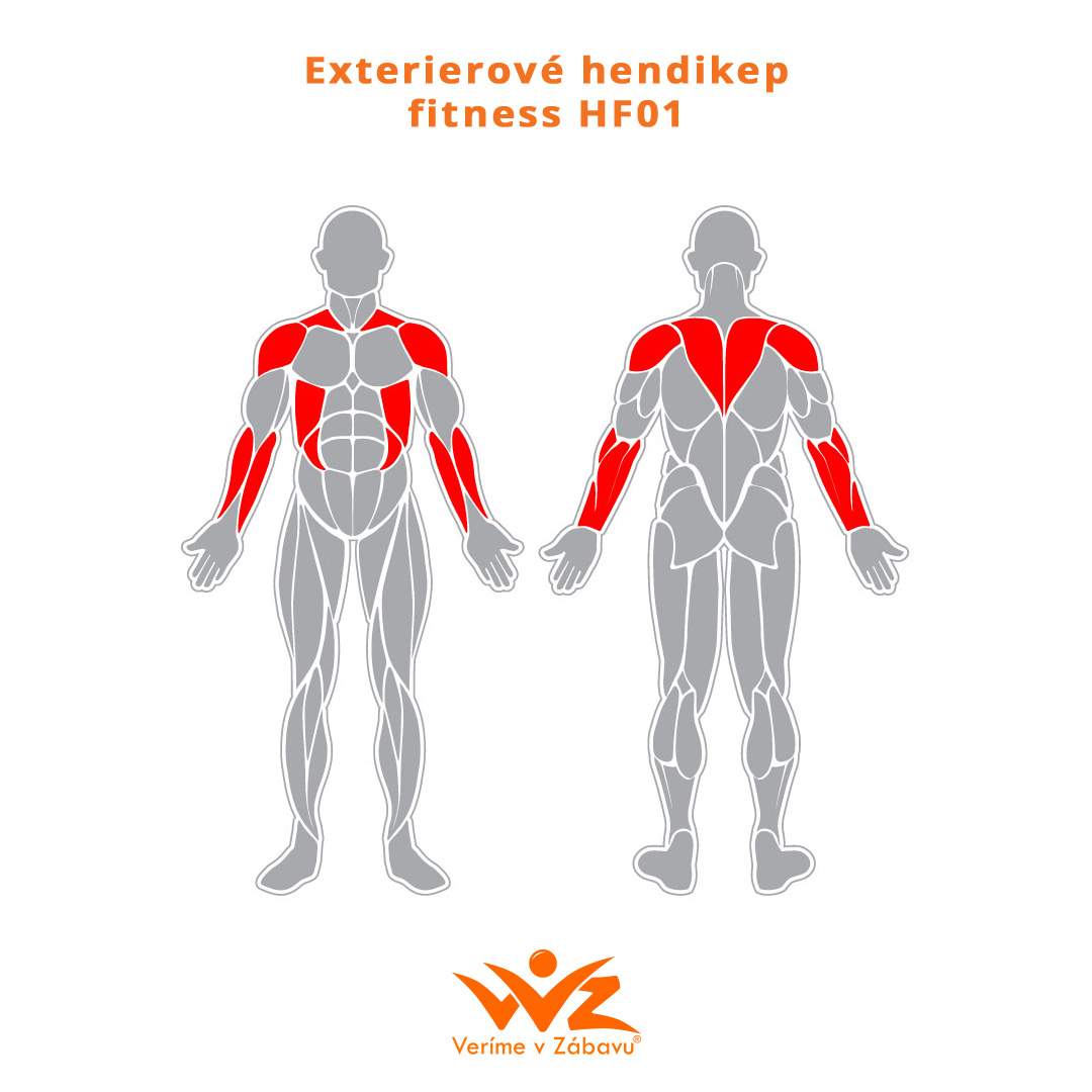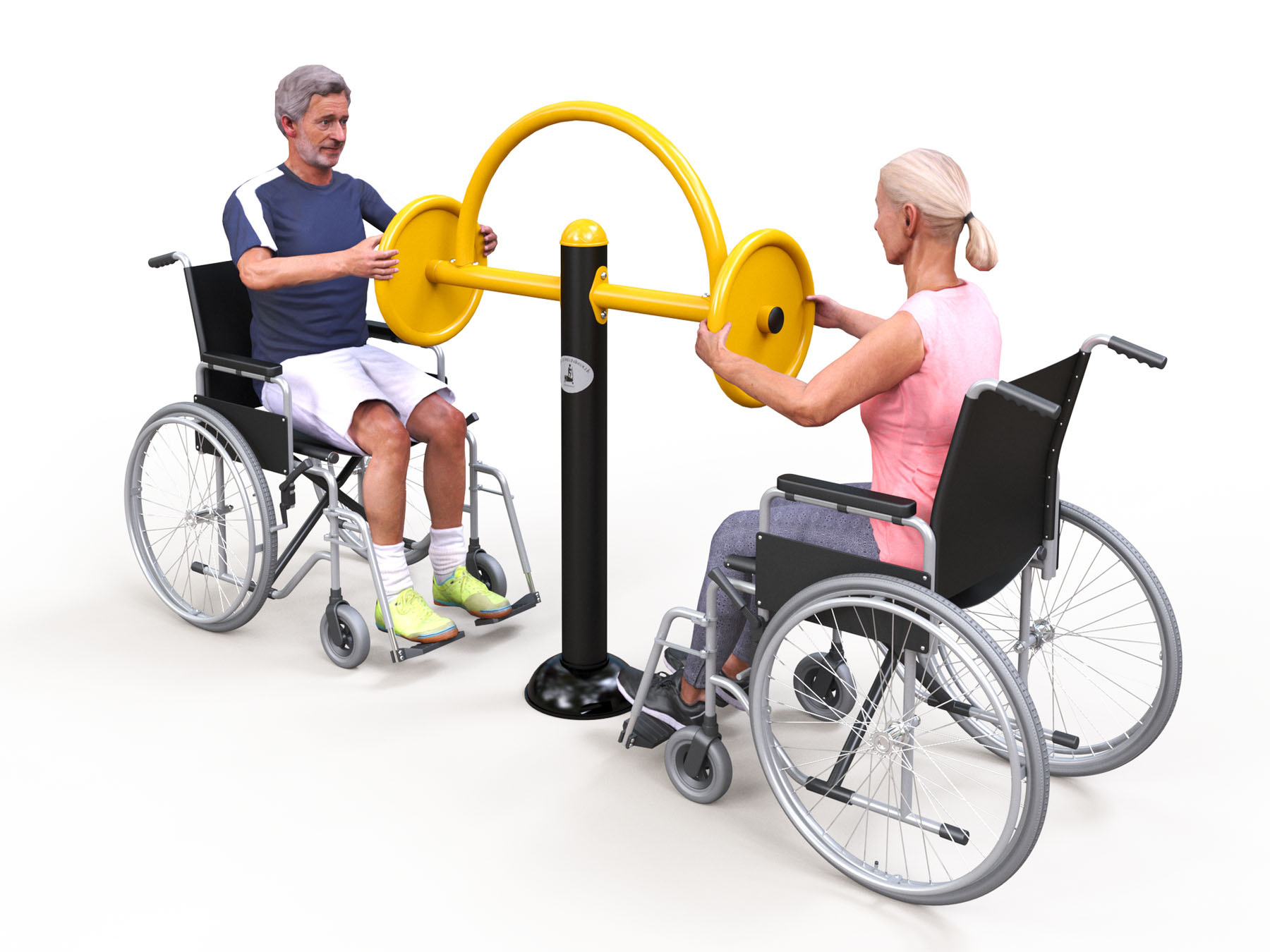 HF01 kültéri fitneszgép mozgássérültek részére - a felső végtagok izmainak és ízületeinek edzésére szolgál a vállaktól a könyökön át a csuklóig. A gép elhelyezéséhez szükséges minimális területnek 4100 x 3400 mm-nek kell lennie.