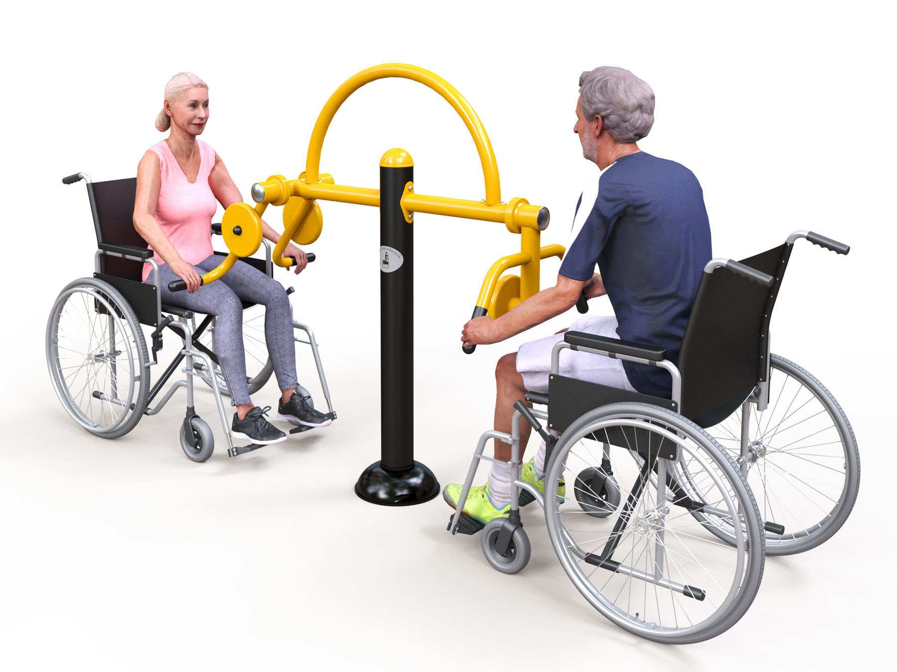 HF08 kültéri fitneszgép mozgássérültek részére - a felső végtagok tornáztatására szolgál súlyok segítségével, kétféle módon. A gép elhelyezéséhez szükséges minimális területnek 4370 x 3700 mm-nek kell lennie.