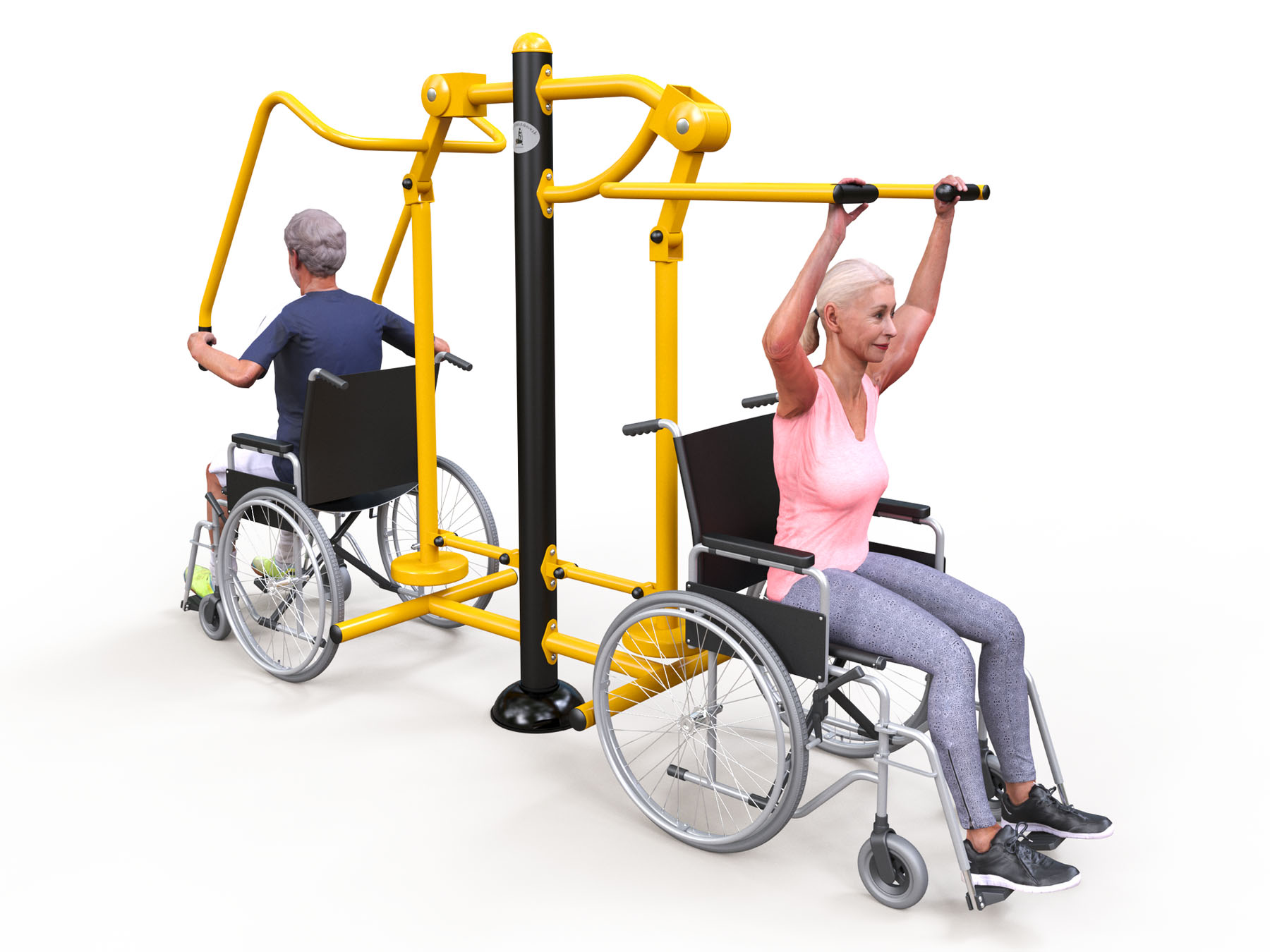 HF10 kültéri fitneszgép mozgássérültek részére - a felső végtagok, a hát, a vállak és a hasizom tornáztatására szolgál. A gép elhelyezéséhez szükséges minimális területnek 5000 x 3800 mm-nek kell lennie.