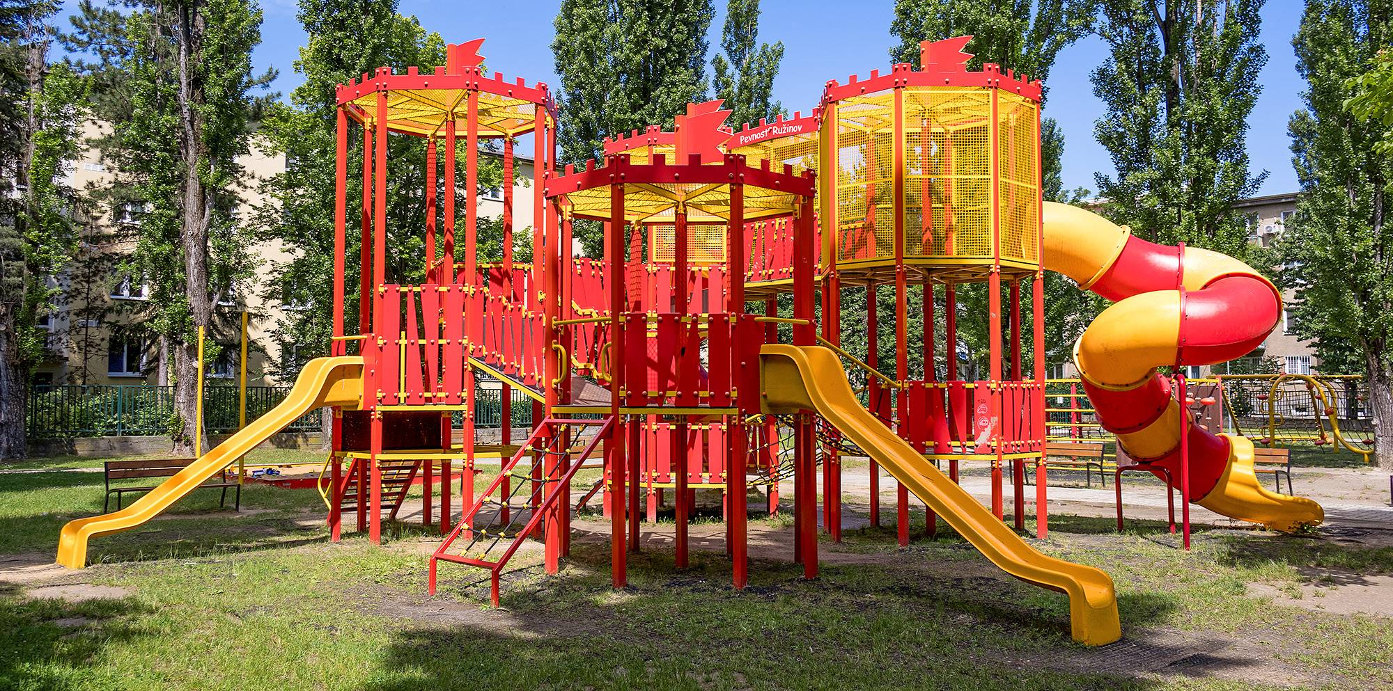 Minden elem biztonságos, modern és a legújabb szabványoknak megfelelő. A két domináns elem a ružinovi erőd - a ružinovi várunk eddigi legnagyobb vára, két csúszdával és két szánkóval, valamint Pozsony, és talán Szlovákia legnagyobb kötélmászófala, amelyet egyedileg készítettek nekünk.