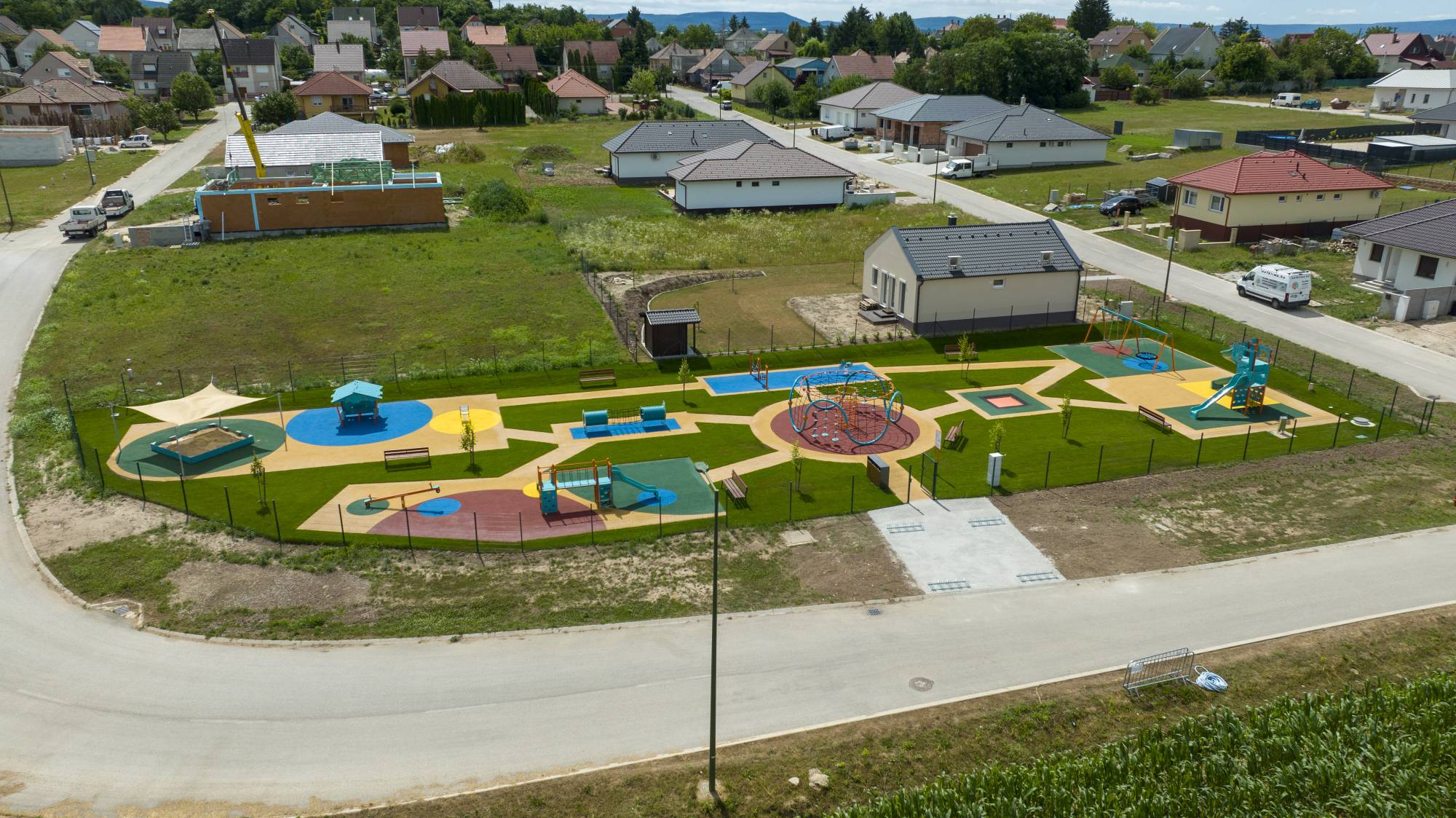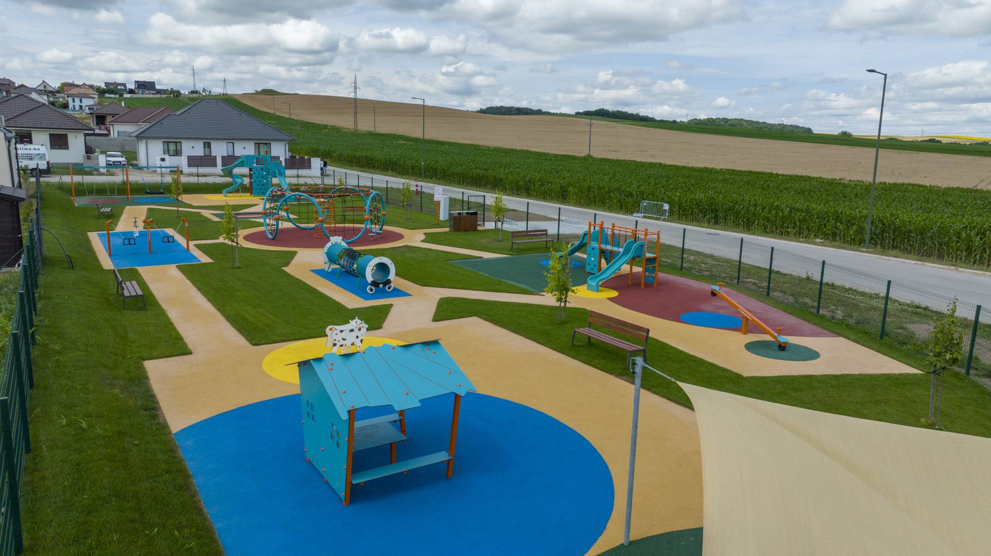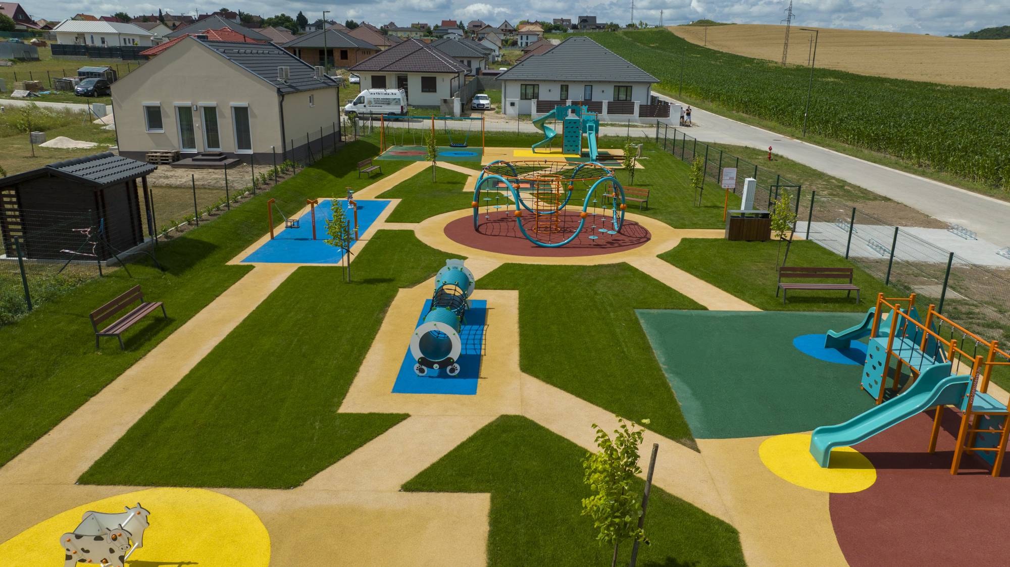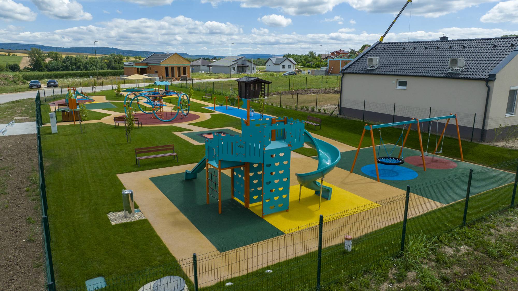 Modern játszóteret építettünk a Környe Községben található Bajcsy lakóparkban. A nagyméretű játszótér számos elemet tartalmaz, például játszóvárat, trambulint, hintát, libikókát, homokozót, alagutat és kötélelemeket.