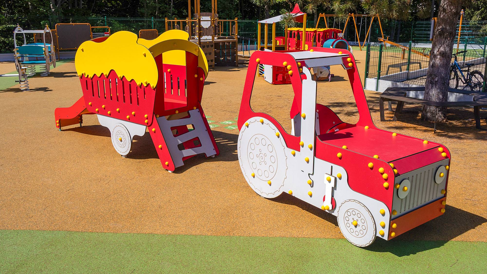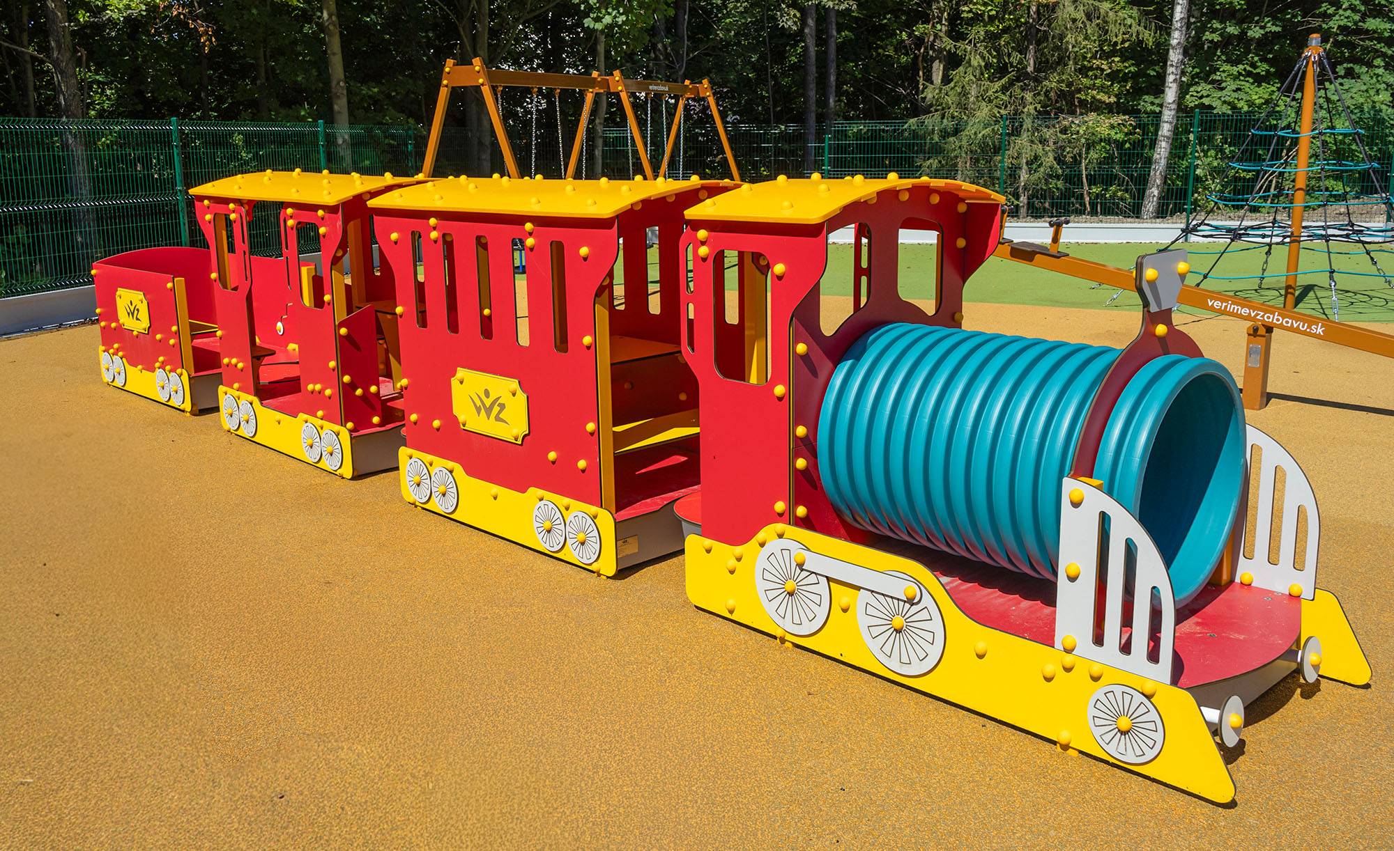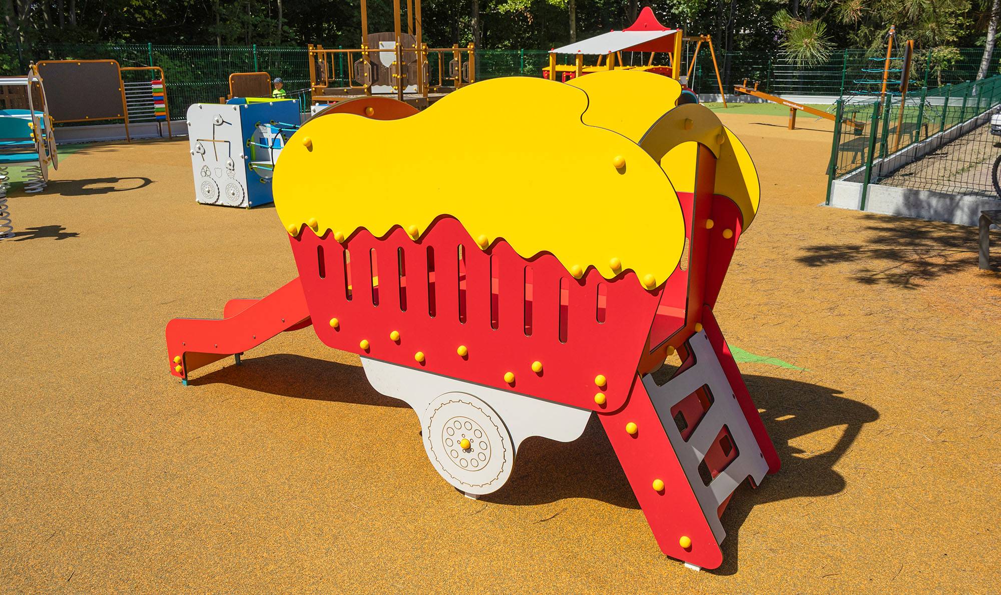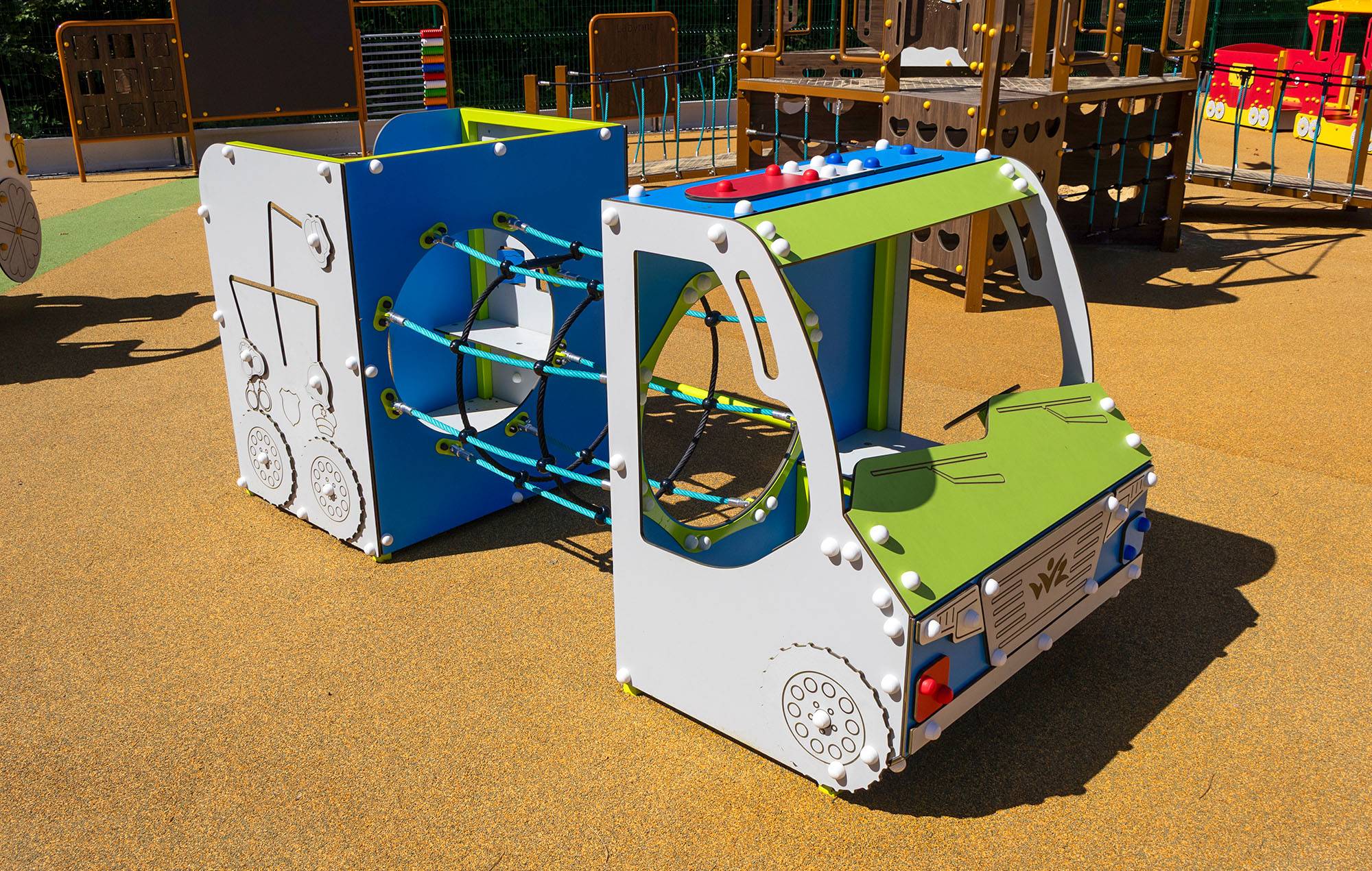 A játszótér tele van különféle játékelemekkel, amelyek ötvözik a mozgást, a képzeletet és a közös játékot: