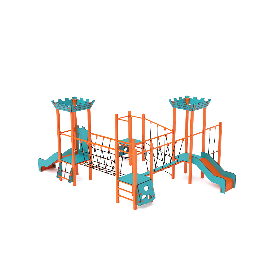 A négytornyú mini játszóvár tartó szerkezete horganyzott és porszórt acélból, padlói, ferde- és függőleges mászófalai, masszív hídja, koronái és a mellvéd HPL jelölésű magas nyomású laminált kompaktlemezből, kötélrendszere acélmagos poliészter kötélből, csúszdái pedig HDPE műanyag és HPL kompaktlemez kombinációjából készülnek. A magas nyomású HPL lemez törhetetlen, nem mérgező, újrahasznosítható, továbbá vegyszer- és UV álló. A poliészter szálakból készült acélmagos kötél magas szilárdsággal bír és ezáltal jobban ellenáll a mechanikai igénybevételnek. Maga a poliészter számos pozitív tulajdonsággal rendelkezik. Színtartó, ellenáll a mikroorganizmusoknak, az időjárási hatásoknak, (pl. eső után gyorsan szárad). A HDPE jelölésű, nagy sűrűségű polietilén lapokat főként magas szilárdságuk, szívósságuk és nedvességállóságuk jellemzik. Minden kötőelem rozsdamentes acélból készül és a fokozott tartósság és biztonság érdekében műanyag kupakkal van lezárva. A használt anyagoknak köszönhetően az eszköz minimális karbantartást igényel! A játékeszközt úgy terveztük, hogy a hosszú élettartam mellett a maximális biztonságot is garantálja!