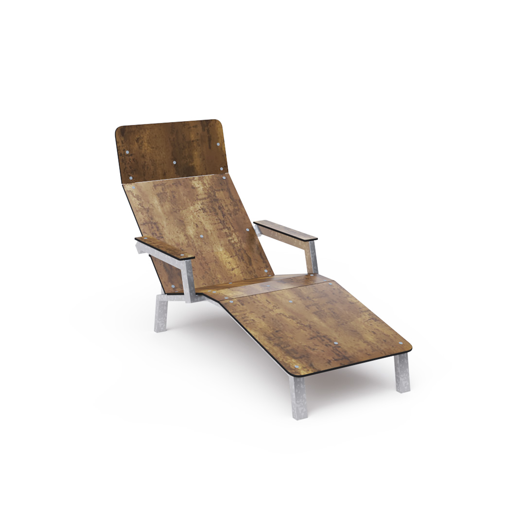 A szerkezet acélból készül, amelyet tűzihorganyzással kezelnek. Az ülőfelület és a kartámaszok 10 mm vastag, természetes mintázatú HPL anyagból készülnek. Az összes kötés anyaga rozsdamentes acél. Ez az anyagkombináció garantálja a tartósságot és a hosszú élettartamot.