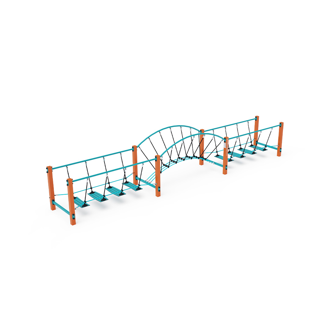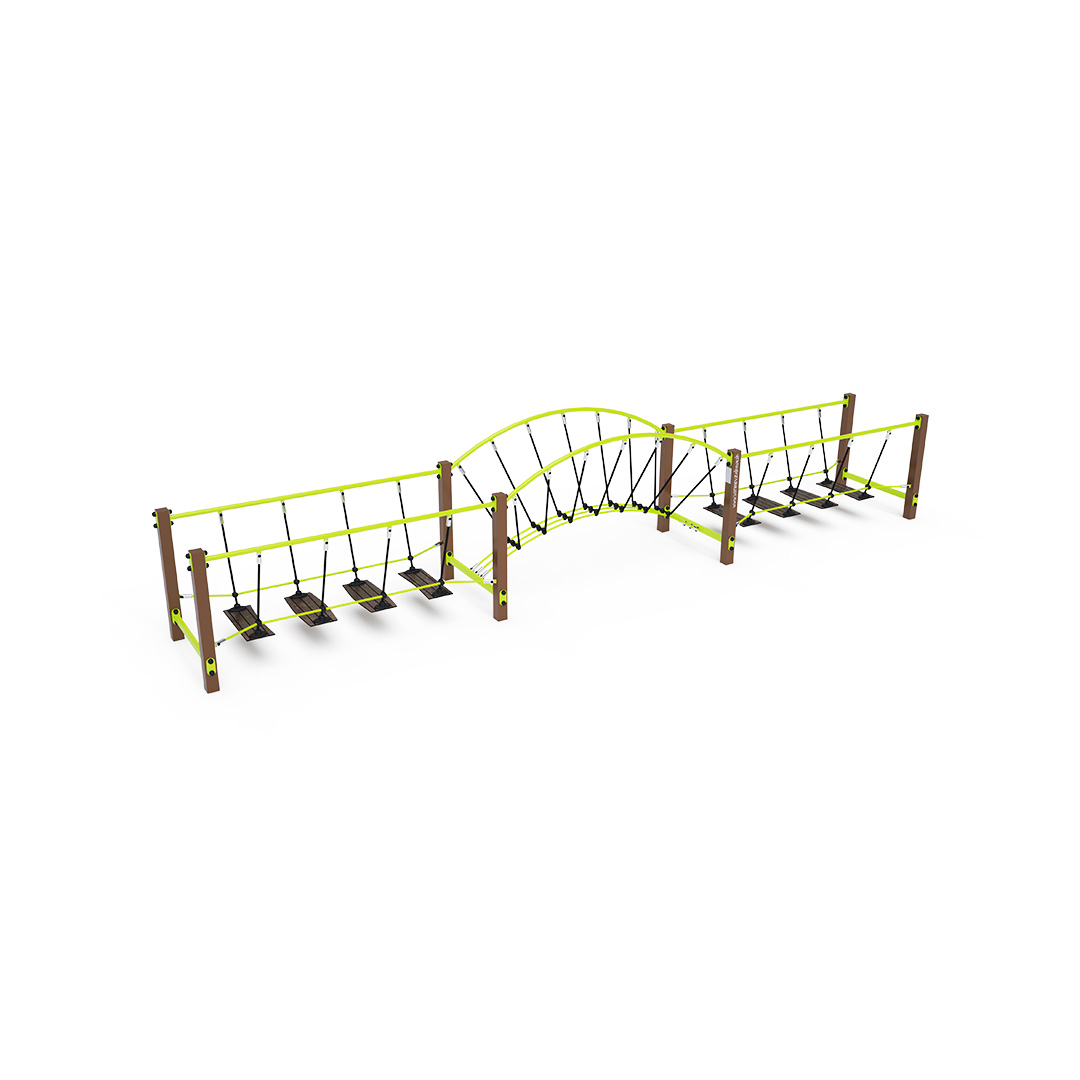 A három részből álló, lépegető lapokkal ellátott kötélhíd szerkezete acélból, lépegetőlapjai csúszásmentes HPL jelölésű magas nyomású laminált kompaktlemezből és kötélrendszere pedig acélmagos poliészter kötélből készül. A magas nyomású HPL lemez törhetetlen, nem mérgező, újrahasznosítható, továbbá vegyszer- és UV-álló, így nem áll fenn annak a veszélye, hogy a gyermekek megsérülnek a játszás közben.készül. Az acél szerkezet horgany és KOMAXIT égetett porfesték felületkezelést kap. A poliészter szálakból készült acélmagos kötél magas szilárdsággal bír és ez által jobban ellenáll a mechanikai igénybevételnek. Maga a poliészter számos pozitív tulajdonsággal rendelkezik. Színtartó, ellenáll a mikroorganizmusoknak, az időjárási hatásoknak, (pl. eső után gyorsan szárad). Ezeknek az anyagoknak köszönhetően az eszköz minimális karbantartást igényel! A játékeszközt úgy terveztük, hogy a hosszú élettartam mellett a maximális biztonságot is garantálja! A kötélhíd ideális játékeszköz a kisebb gyermekek szórakoztatására! A kötélhídon a gyermekek a stabilitást és a koordinációt gyakorolhatják.