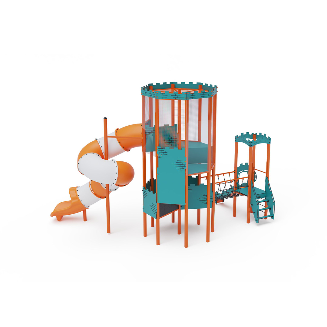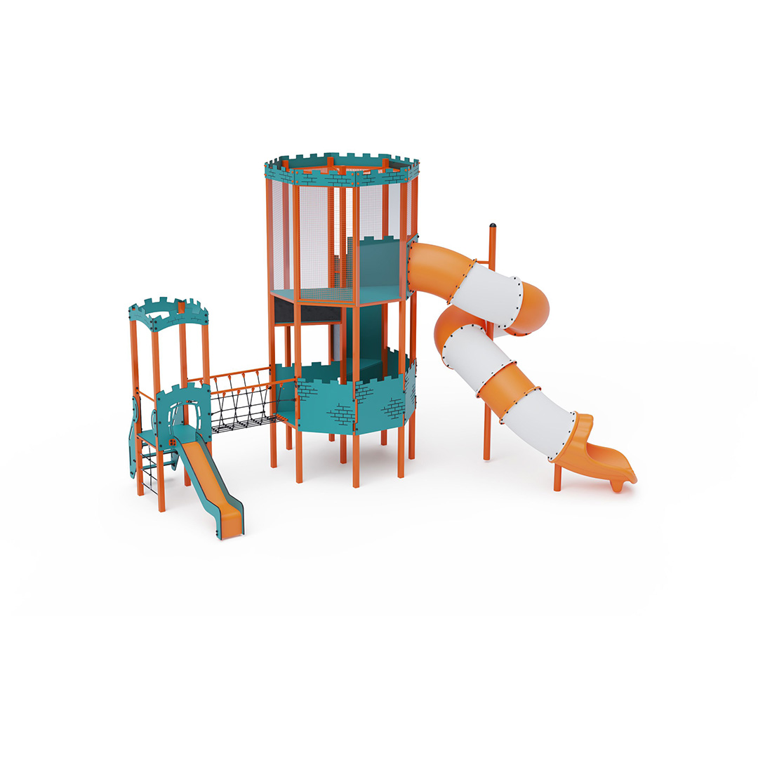 Két toronyból álló kombinált szett - egy torony, amelyen a gyerekek felmászhatnak a lépcsőn vagy kötélen mászhatnak, és lecsúszhatnak a csúszdán vagy szánkón. A türkiz-narancssárga dizájn messziről vonzza a gyerekeket a játékra. Az acélszerkezet időjárásálló a tűzihorganyzásnak és a tartós porfestésnek köszönhetően. A felhasznált HPL anyag kémiailag ellenálló, UV-sugárzásnak ellenálló - színtartó, nem mérgező, újrahasznosítható és törhetetlen.