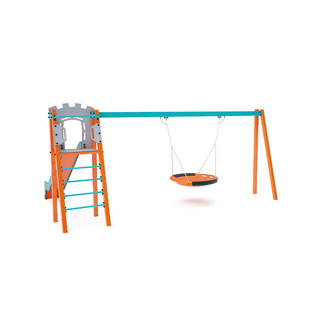 A csúszdával és fészekhinta kosárral felszerelt egyrészes lengőhinta tartó szerkezete horganyzott és porszórt acélból, padlója és mellvédje HPL jelölésű magas nyomású laminált kompaktlemezből, csúszdája pedig HDPE műanyag és HPL kompaktlemez kombinációjából készül. A magas nyomású HPL lemez törhetetlen, nem mérgező, újrahasznosítható, továbbá vegyszer- és UV álló. A HDPE jelölésű, nagy sűrűségű polietilén lapokat főként magas szilárdságuk, szívósságuk és nedvességállóságuk jellemzik. Minden kötőelem rozsdamentes acélból készül és a fokozott tartósság és biztonság érdekében műanyag kupakkal van lezárva. A használt anyagoknak köszönhetően az eszköz minimális karbantartást igényel! A játékeszközt úgy terveztük, hogy a hosszú élettartam mellett a maximális biztonságot is garantálja!