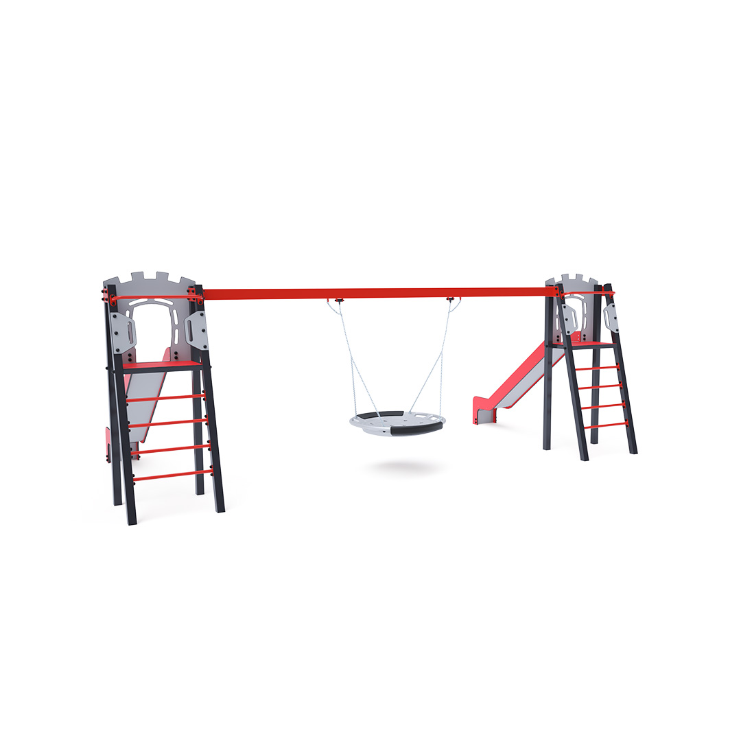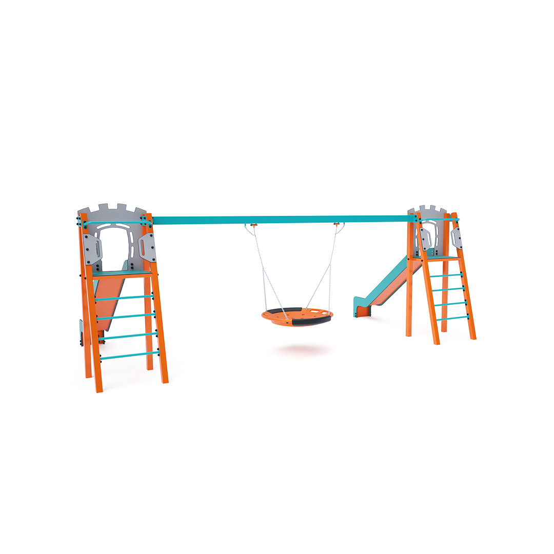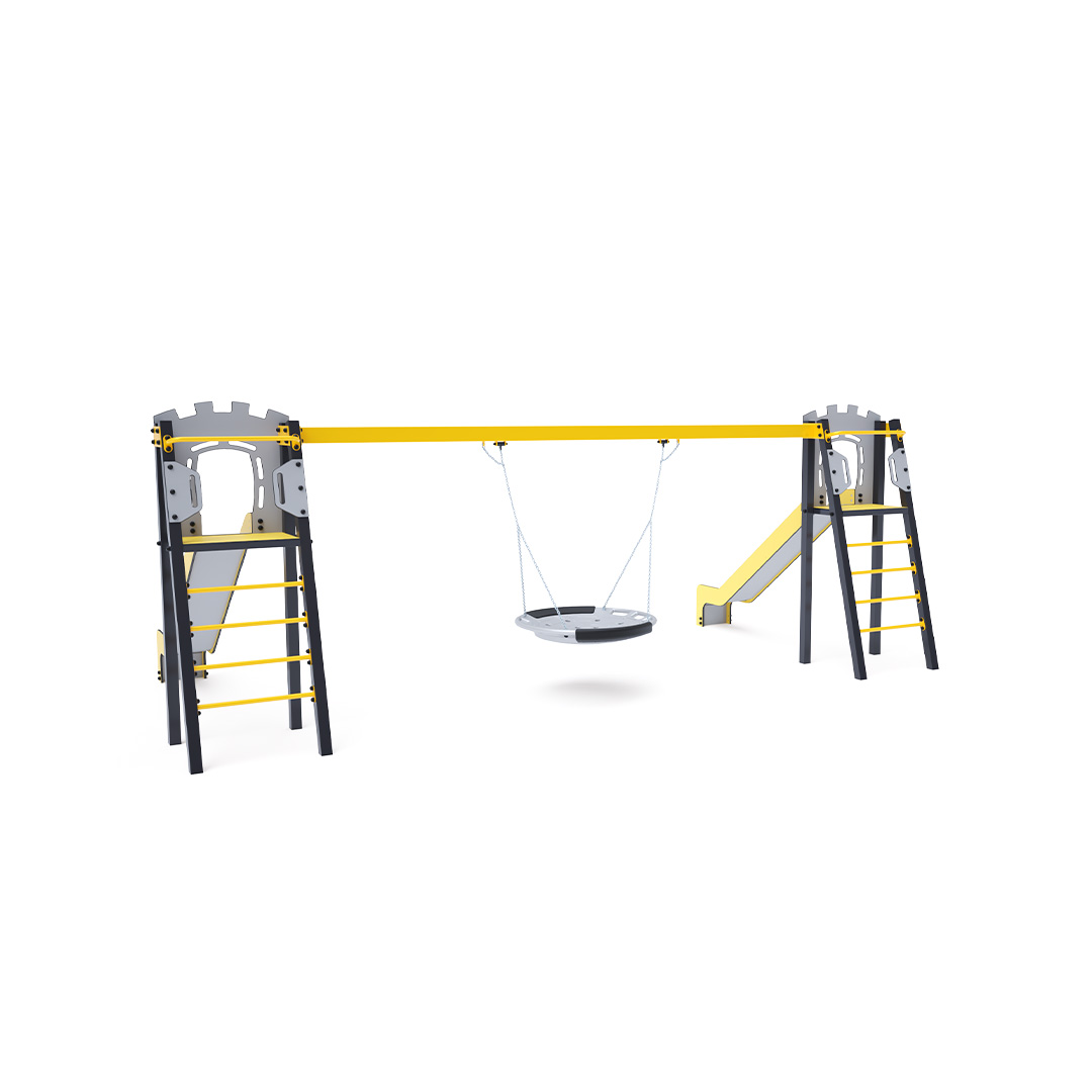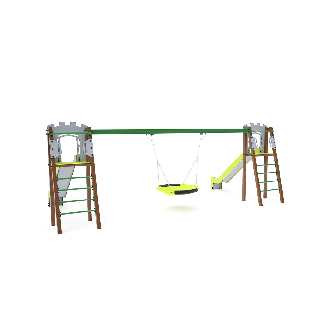 A csúszdákkal és fészekhinta kosárral felszerelt egyrészes lengőhinta tartó szerkezete horganyzott és porszórt acélból, padlói és a mellvédek HPL jelölésű magas nyomású laminált kompaktlemezből, csúszdái pedig HDPE műanyag és HPL kompaktlemez kombinációjából készül. A magas nyomású HPL lemez törhetetlen, nem mérgező, újrahasznosítható, továbbá vegyszer- és UV álló. A HDPE jelölésű, nagy sűrűségű polietilén lapokat főként magas szilárdságuk, szívósságuk és nedvességállóságuk jellemzik. Minden kötőelem rozsdamentes acélból készül és a fokozott tartósság és biztonság érdekében műanyag kupakkal van lezárva. A használt anyagoknak köszönhetően az eszköz minimális karbantartást igényel! A játékeszközt úgy terveztük, hogy a hosszú élettartam mellett a maximális biztonságot is garantálja!
