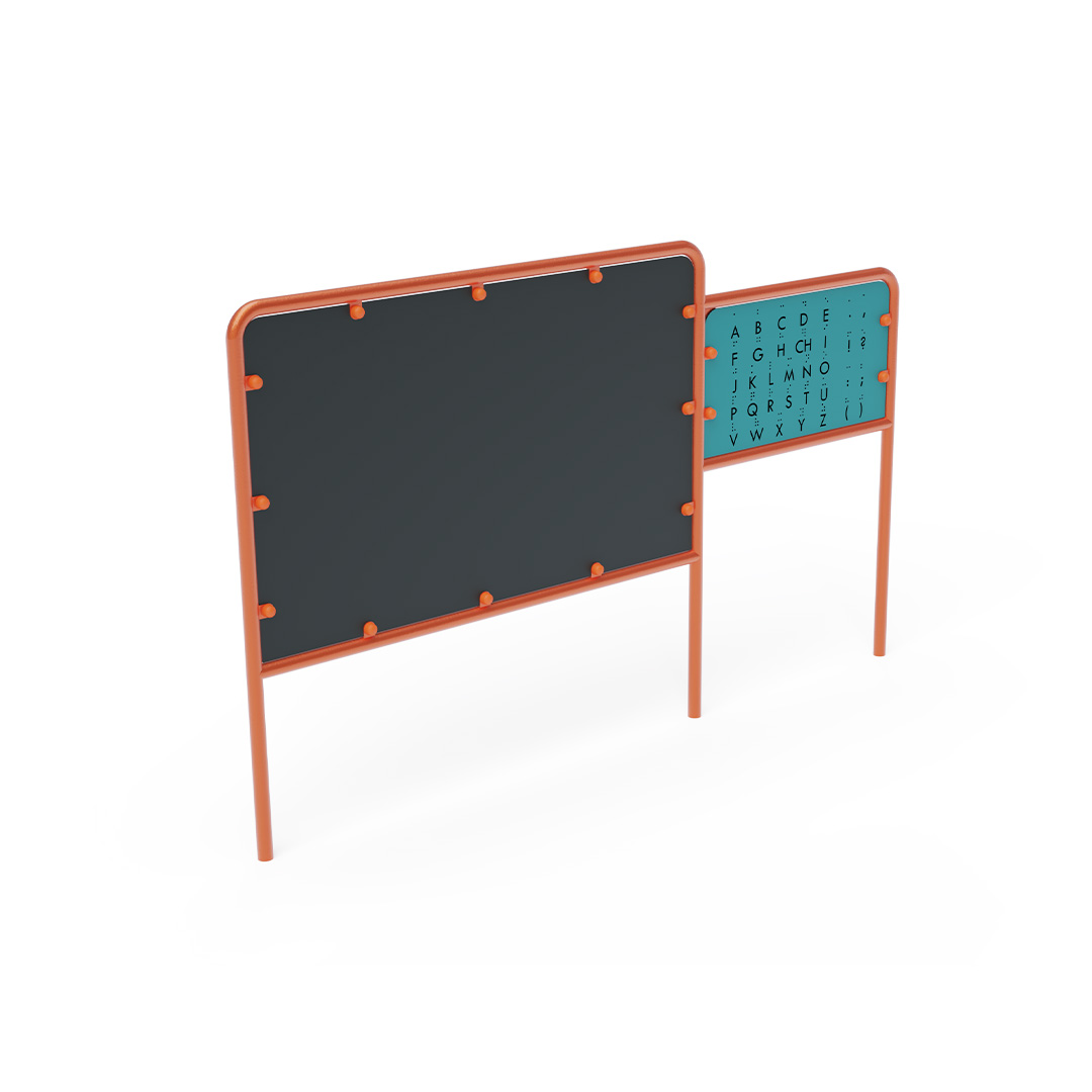 A kétoldalú rajztáblával kiegészített latin és Braille ABC-t, valamint néhány alap írásjelet ábrázoló edukációs tábla tartó szerkezete horganyzott és porszórt acélból, lapja pedig HPL jelölésű magas nyomású laminált kompaktlemezből készül. A magas nyomású HPL lemez törhetetlen, nem mérgező, újrahasznosítható, továbbá vegyszer- és UV álló. Minden kötőelem rozsdamentes acélból készül és a fokozott tartósság és biztonság érdekében műanyag kupakkal van lezárva. A használt anyagoknak köszönhetően az eszköz minimális karbantartást igényel! A játékeszközt úgy terveztük, hogy a hosszú élettartam mellett a maximális biztonságot is garantálja!