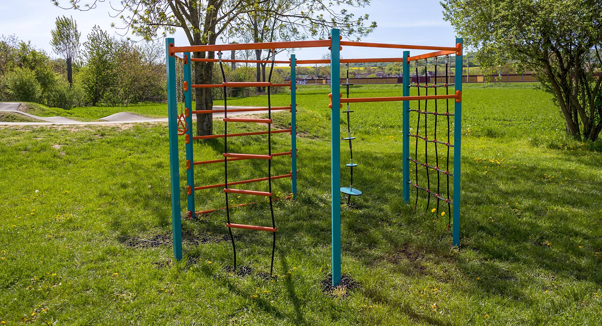 - Ütéscsillapító megoldások: gyöngykavics és folyami homok 300 mm rétegvastagságban, továbbá gyeprács, gumitégla vagy öntött gumiburkolat
