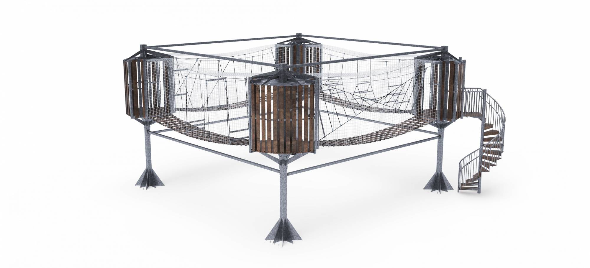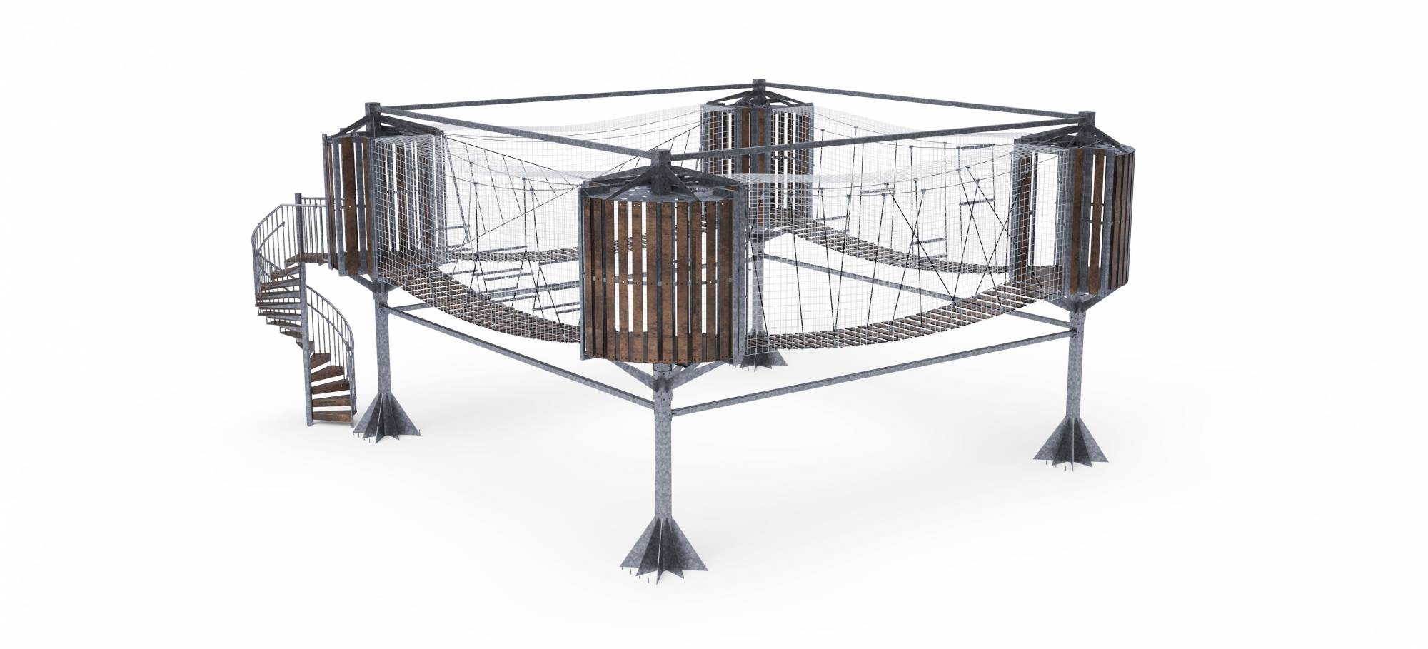 - Használt anyagok: tűzihorganyzott acélszerkezet, magas nyomású HPL laminált kompaktlemez, poliészter kötél, rozsdamentes acél kötél, rozsdamentes acél kötőelemek, nagy szilárdságú rögzítőelemek