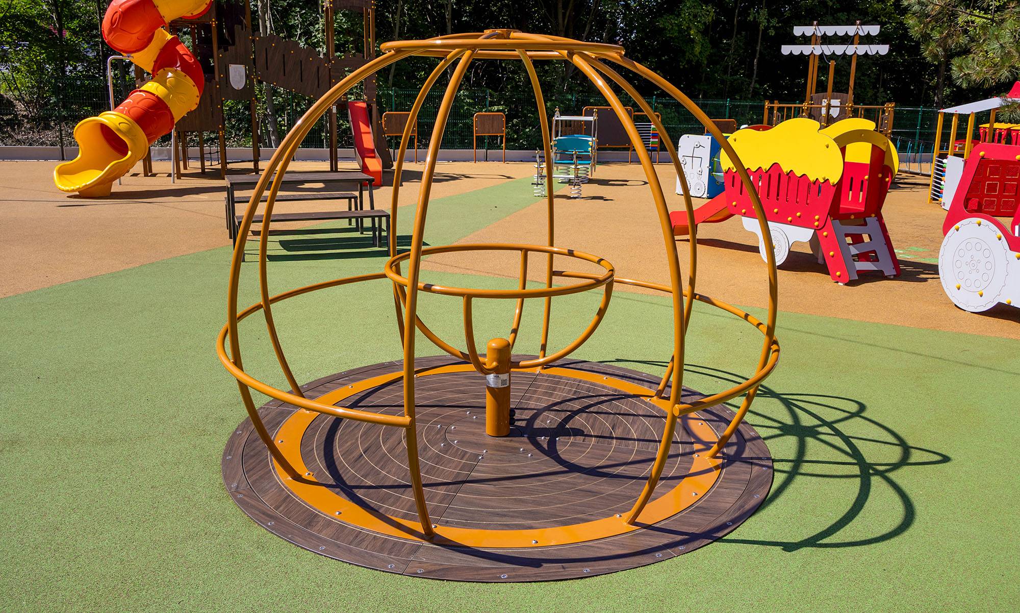 A 2,5 méter átmérőjű, földgömböt ábrázoló akadálymentesített körhinta kialakításának köszönhetően, megkülönböztetés nélkül kínál szórakozást minden gyermek számára. Szerkezete horganyzott és porszórt acélból és a padló HPL jelölésű magas nyomású laminált kompaktlemezből készül. A magas nyomású HPL lemez törhetetlen, nem mérgező, újrahasznosítható, továbbá vegyszer- és UV álló. A használt anyagoknak köszönhetően az eszköz minimális karbantartást igényel! A játékeszközt úgy terveztük, hogy a hosszú élettartam mellett a maximális biztonságot is garantálja!