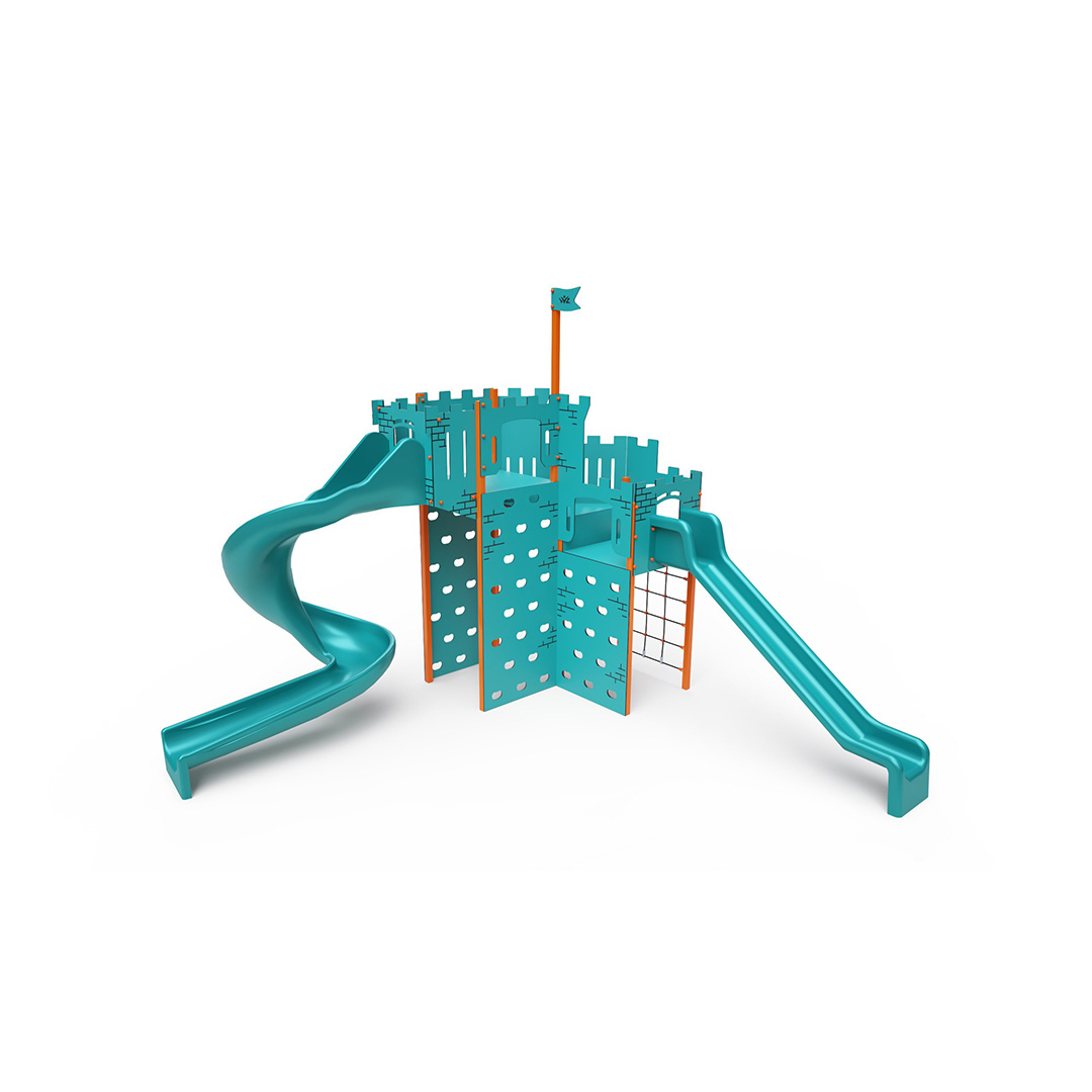 A csúszdákkal és kötélhálóval felszerelt vár alakú mászófal tartó szerkezete horganyzott és porszórt acélból, lapjai HPL jelölésű magas nyomású laminált kompaktlemezből, kötélrendszere acélmagos poliészter kötélből, csúszdái pedig üvegszál erősítésű poliészter műanyagból készülnek. A magas nyomású HPL lemez törhetetlen, nem mérgező, újrahasznosítható, továbbá vegyszer- és UV álló. A poliészter szálakból készült acélmagos kötél magas szilárdsággal bír és ezáltal jobban ellenáll a mechanikai igénybevételnek. Maga a poliészter számos pozitív tulajdonsággal rendelkezik. Színtartó, ellenáll a mikroorganizmusoknak, az időjárási hatásoknak, (pl. eső után gyorsan szárad). Minden kötőelem rozsdamentes acélból készül és a fokozott tartósság és biztonság érdekében műanyag kupakkal van lezárva. A használt anyagoknak köszönhetően az eszköz minimális karbantartást igényel! A játékeszközt úgy terveztük, hogy a hosszú élettartam mellett a maximális biztonságot is garantálja!