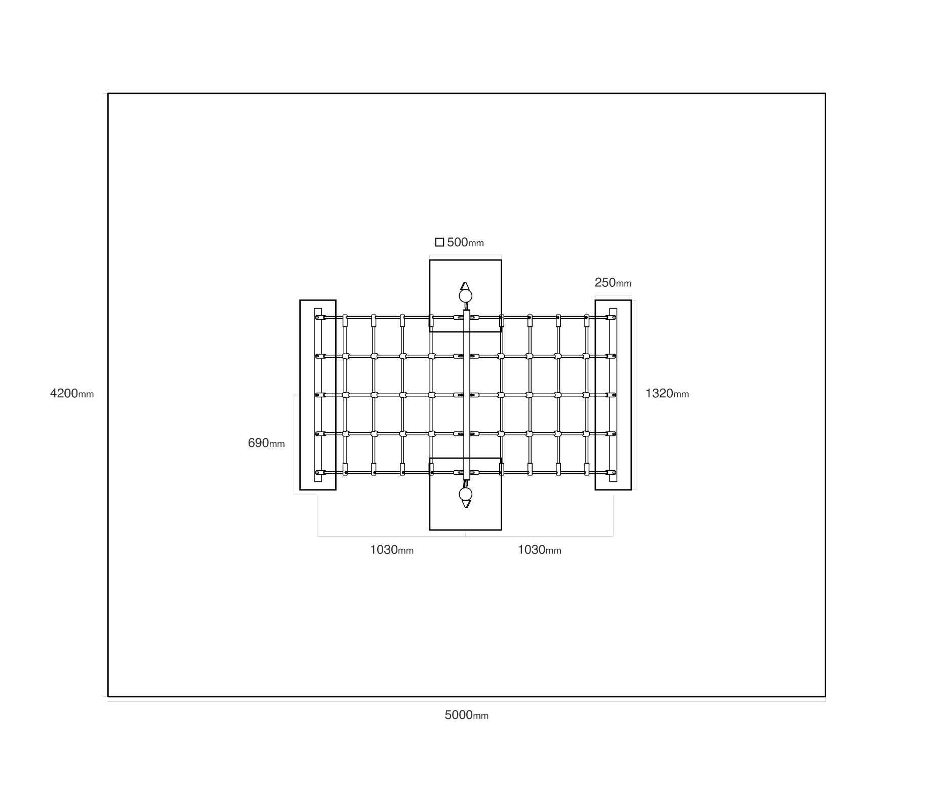 - Biztonsági zóna: 5,0 × 4,2 m