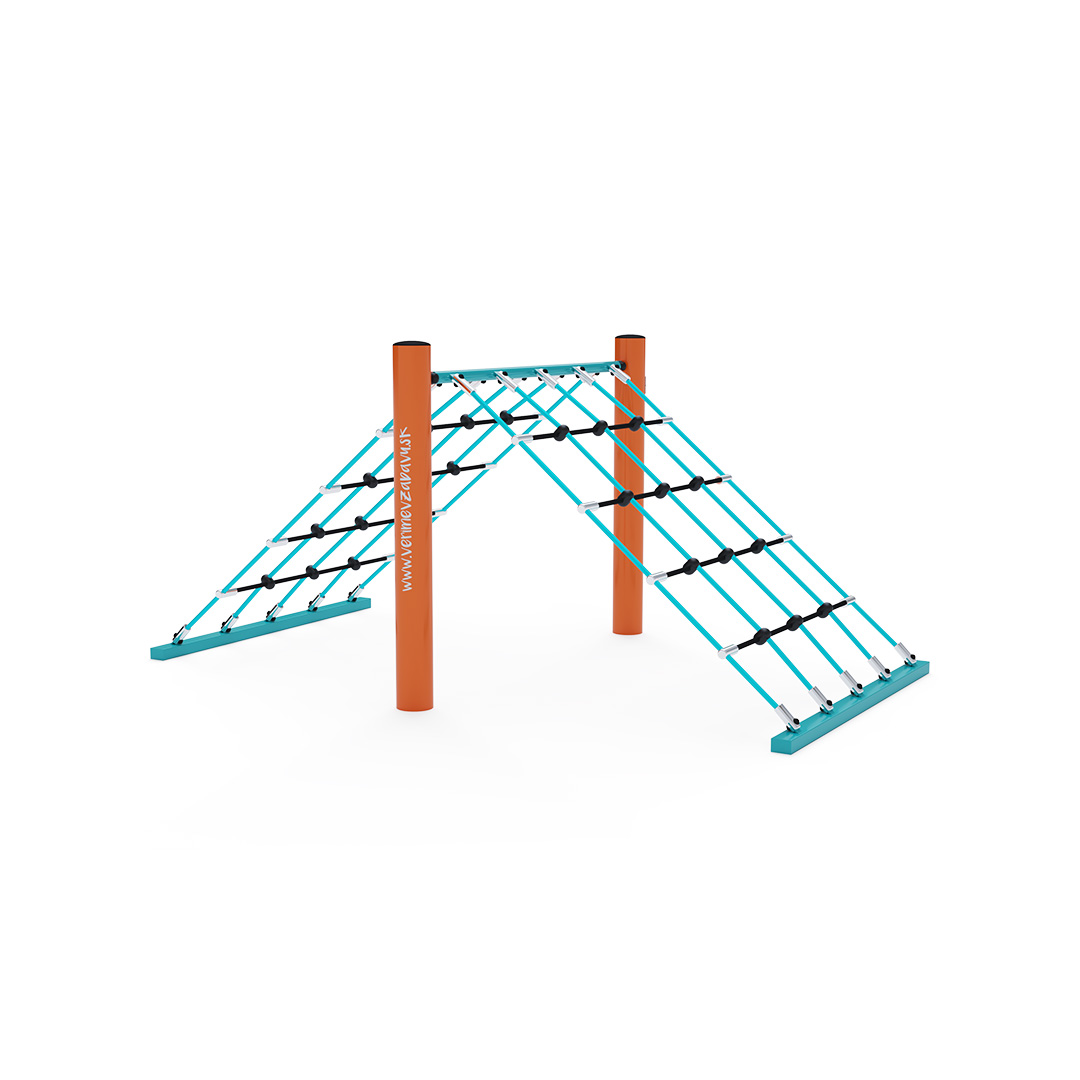 A tető formájú kötélmászóka tartószerkezete horganyzott és porszórt acélból, kötélrendszere pedig acélmagos poliészter kötélből készül. A poliészter szálakból készült acélmagos kötél magas szilárdsággal bír, és ez által jobban ellenáll a mechanikai igénybevételnek. Maga a poliészter számos pozitív tulajdonsággal rendelkezik. Színtartó, ellenáll a mikroorganizmusoknak, az időjárási hatásoknak (pl. eső után gyorsan szárad). Minden kötőelem rozsdamentes acélból készül, és a fokozott tartósság és biztonság érdekében műanyag kupakkal van lezárva. A használt anyagoknak köszönhetően az eszköz minimális karbantartást igényel! A játékeszközt úgy terveztük, hogy a hosszú élettartam mellett a maximális biztonságot is garantálja!