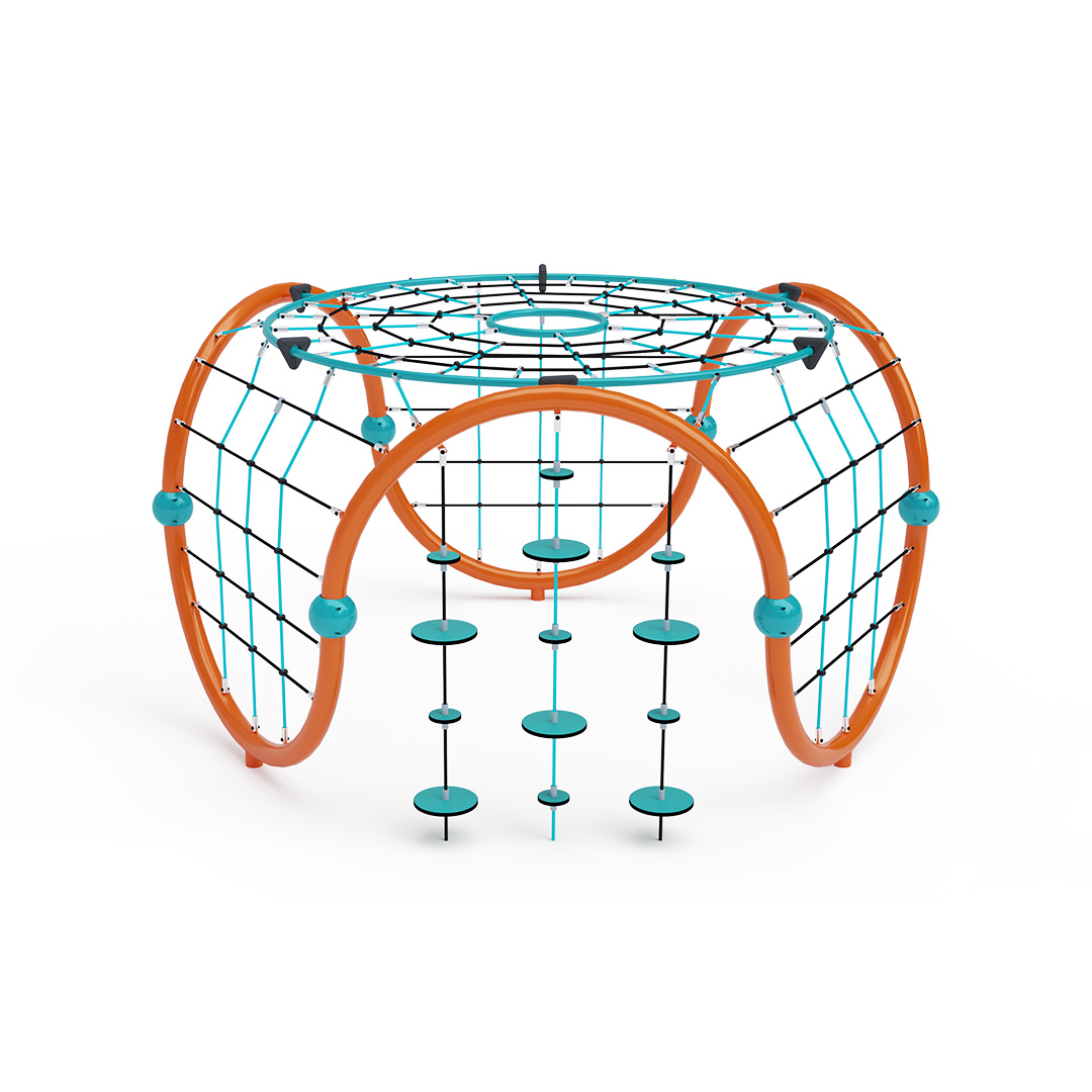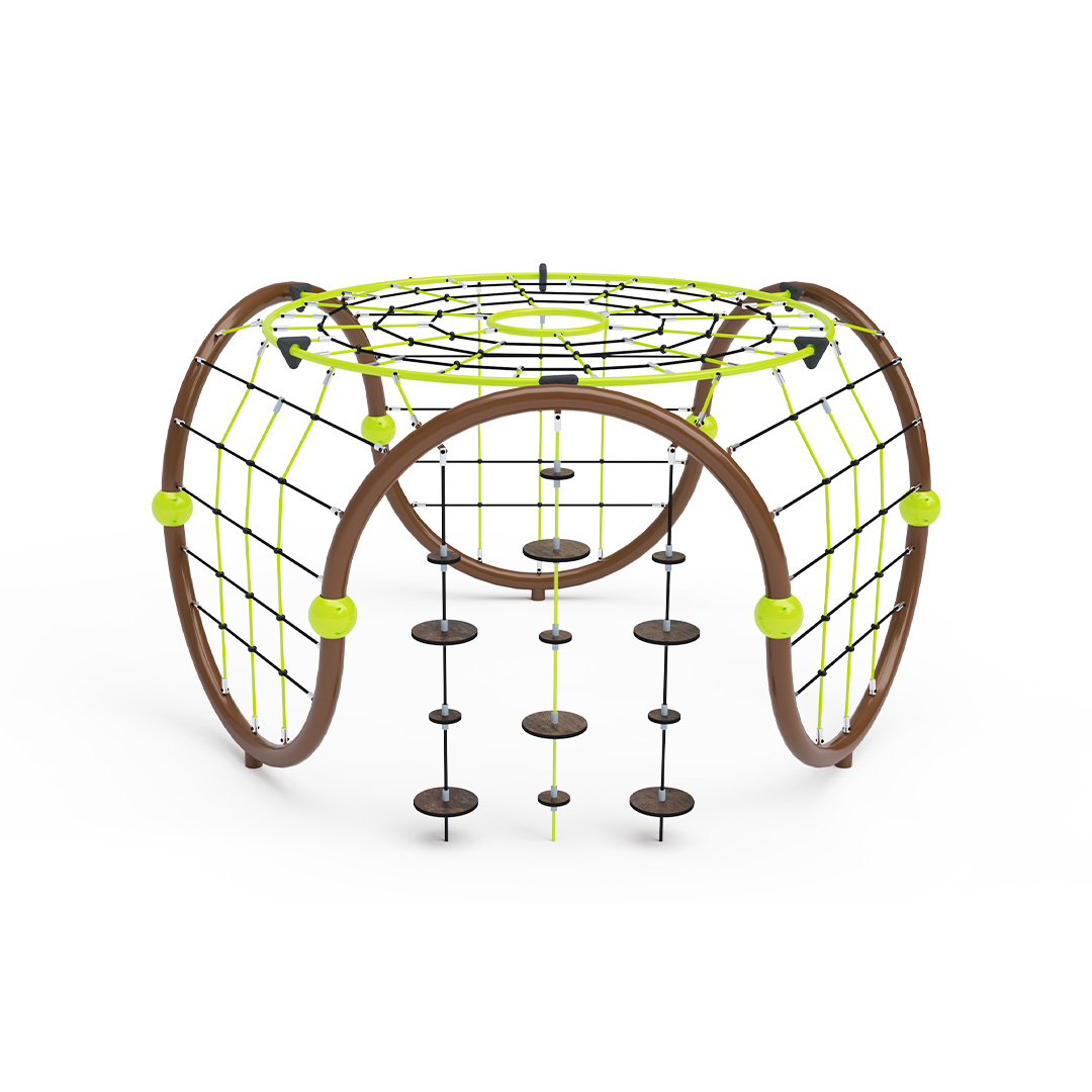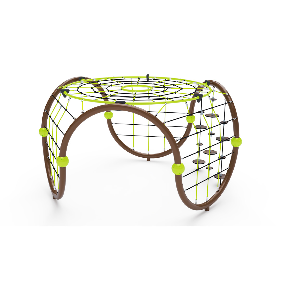 A kisméretű iglu alakú kombinált kötélmászóka tartószerkezete horganyzott és porszórt acélból, kötélrendszere pedig acélmagos poliészter kötélből készül. A poliészter szálakból készült acélmagos kötél magas szilárdsággal bír, és ezáltal jobban ellenáll a mechanikai igénybevételnek. Maga a poliészter számos pozitív tulajdonsággal rendelkezik. Színtartó, ellenáll a mikroorganizmusoknak, az időjárási hatásoknak (pl. eső után gyorsan szárad). Minden kötőelem rozsdamentes acélból készül, és a fokozott tartósság és biztonság érdekében műanyag kupakkal van lezárva. A használt anyagoknak köszönhetően az eszköz minimális karbantartást igényel! A játékeszközt úgy terveztük, hogy a hosszú élettartam mellett a maximális biztonságot is garantálja!