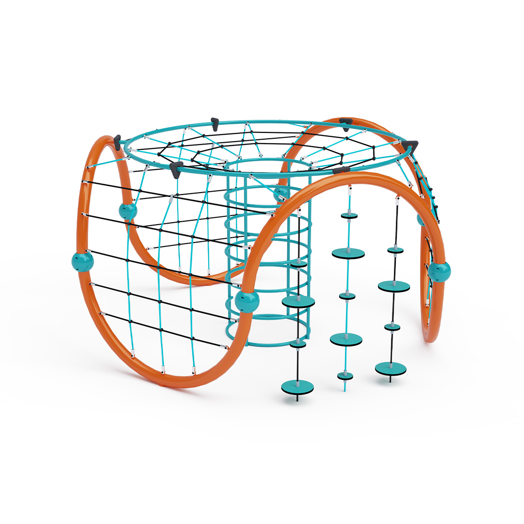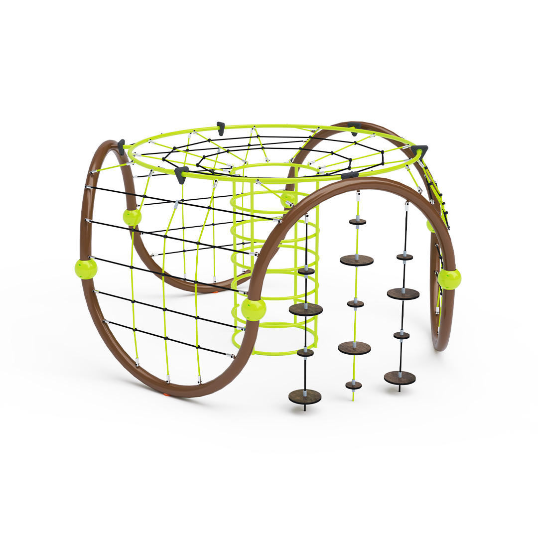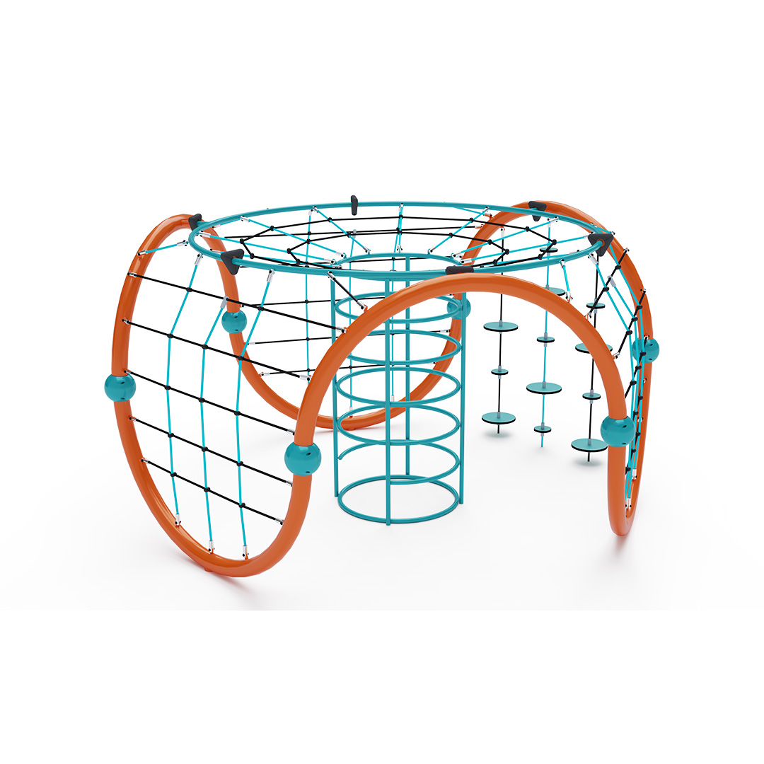 A kisméretű tölcséres, iglu alakú kombinált kötélmászóka tartószerkezete horganyzott és porszórt acélból, kötélrendszere pedig acélmagos poliészter kötélből készül. A poliészter szálakból készült acélmagos kötél magas szilárdsággal bír, és ezáltal jobban ellenáll a mechanikai igénybevételnek. Maga a poliészter számos pozitív tulajdonsággal rendelkezik. Színtartó, ellenáll a mikroorganizmusoknak, az időjárási hatásoknak (pl. eső után gyorsan szárad). Minden kötőelem rozsdamentes acélból készül, és a fokozott tartósság és biztonság érdekében műanyag kupakkal van lezárva. A használt anyagoknak köszönhetően az eszköz minimális karbantartást igényel! A játékeszközt úgy terveztük, hogy a hosszú élettartam mellett a maximális biztonságot is garantálja!