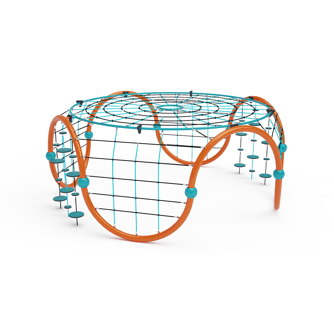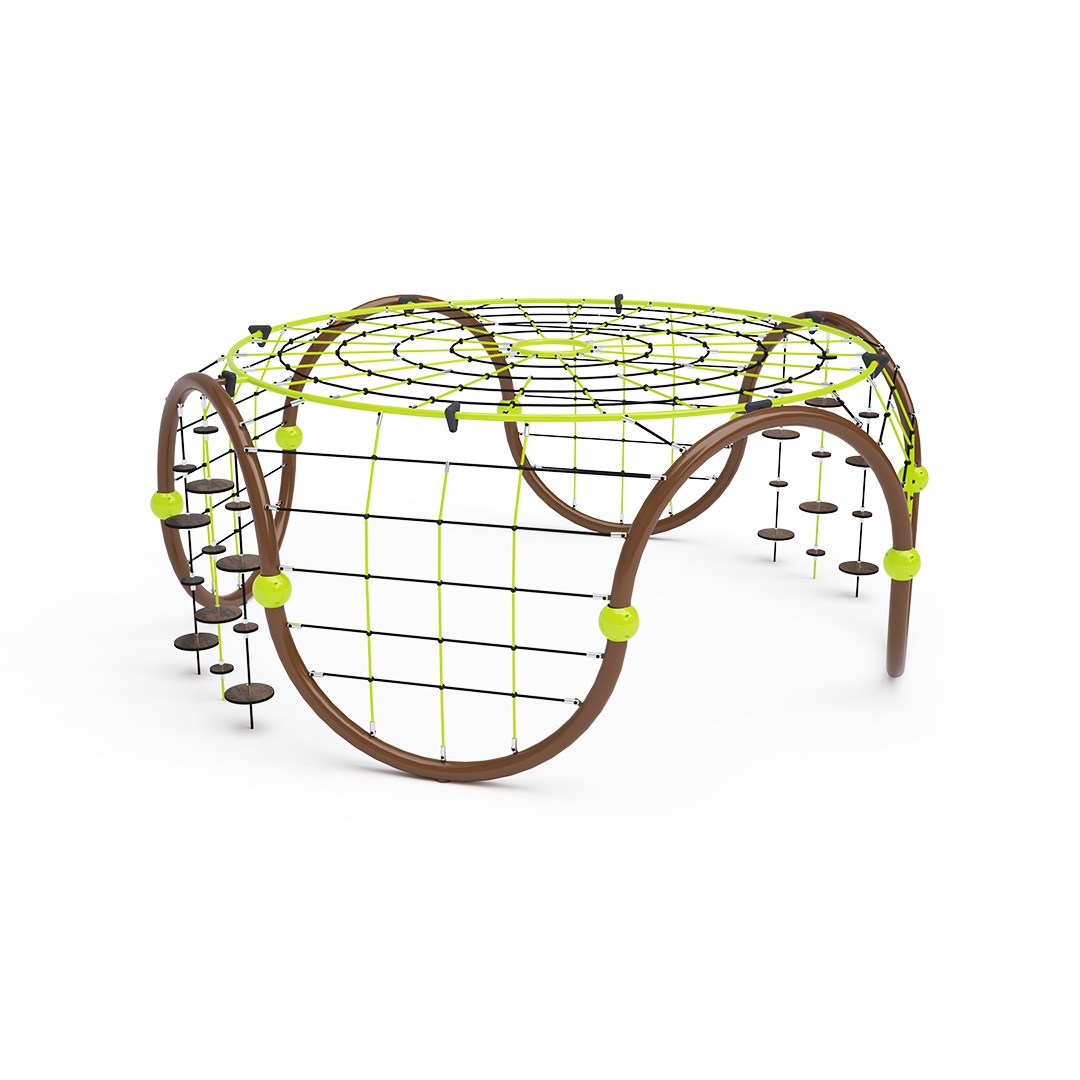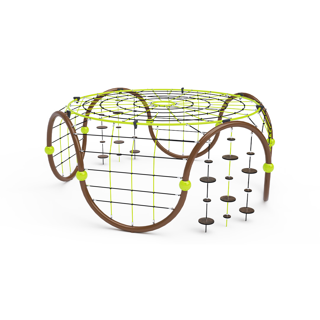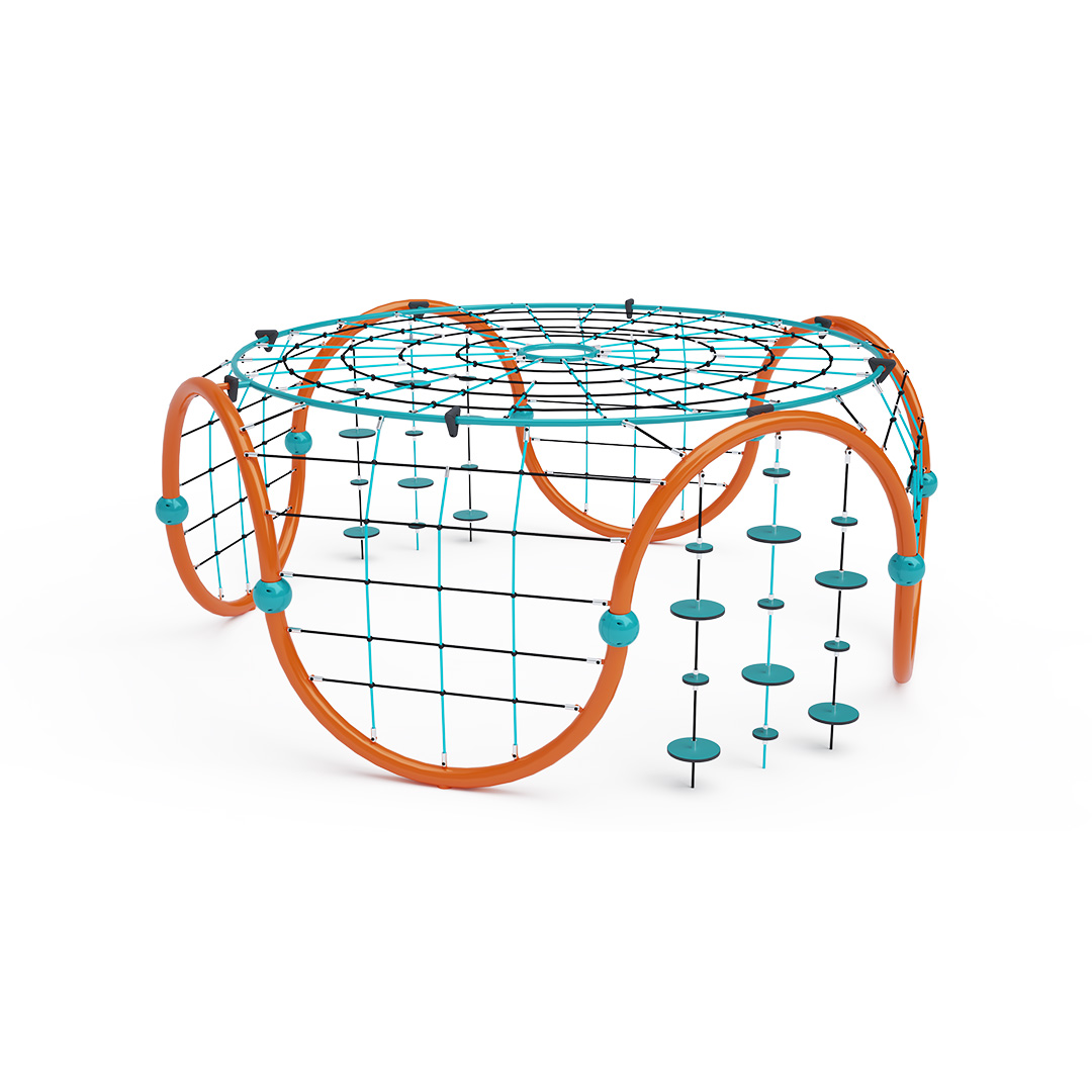 A közepes méretű iglu alakú kombinált kötélmászóka tartószerkezete horganyzott és porszórt acélból, kötélrendszere pedig acélmagos poliészter kötélből készül. A poliészter szálakból készült acélmagos kötél magas szilárdsággal bír, és ezáltal jobban ellenáll a mechanikai igénybevételnek. Maga a poliészter számos pozitív tulajdonsággal rendelkezik. Színtartó, ellenáll a mikroorganizmusoknak, az időjárási hatásoknak (pl. eső után gyorsan szárad). Minden kötőelem rozsdamentes acélból készül, és a fokozott tartósság és biztonság érdekében műanyag kupakkal van lezárva. A használt anyagoknak köszönhetően az eszköz minimális karbantartást igényel! A játékeszközt úgy terveztük, hogy a hosszú élettartam mellett a maximális biztonságot is garantálja!