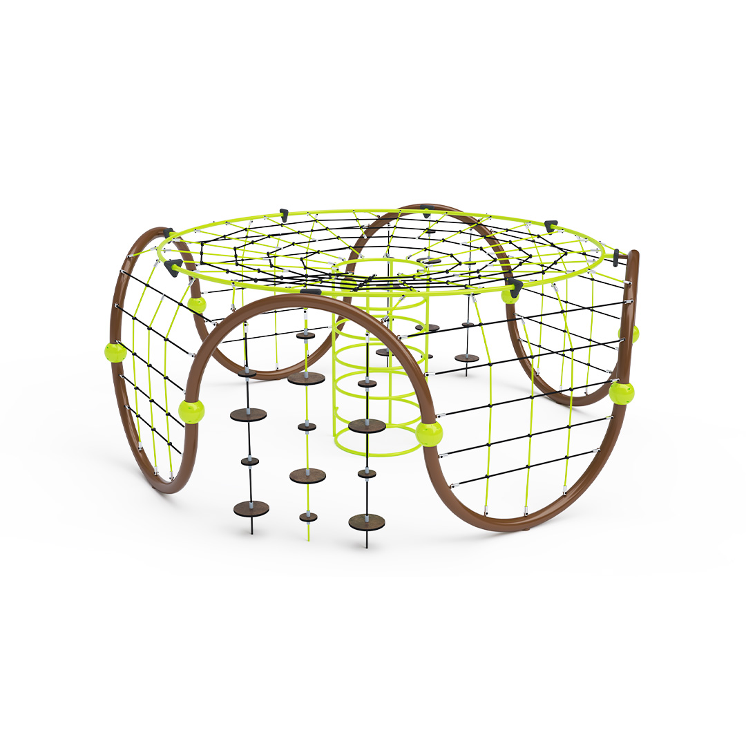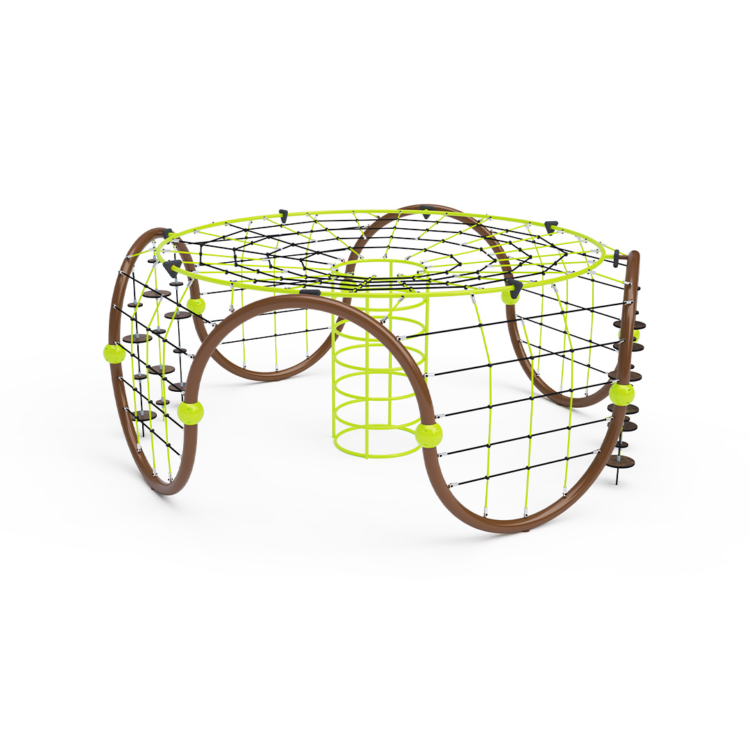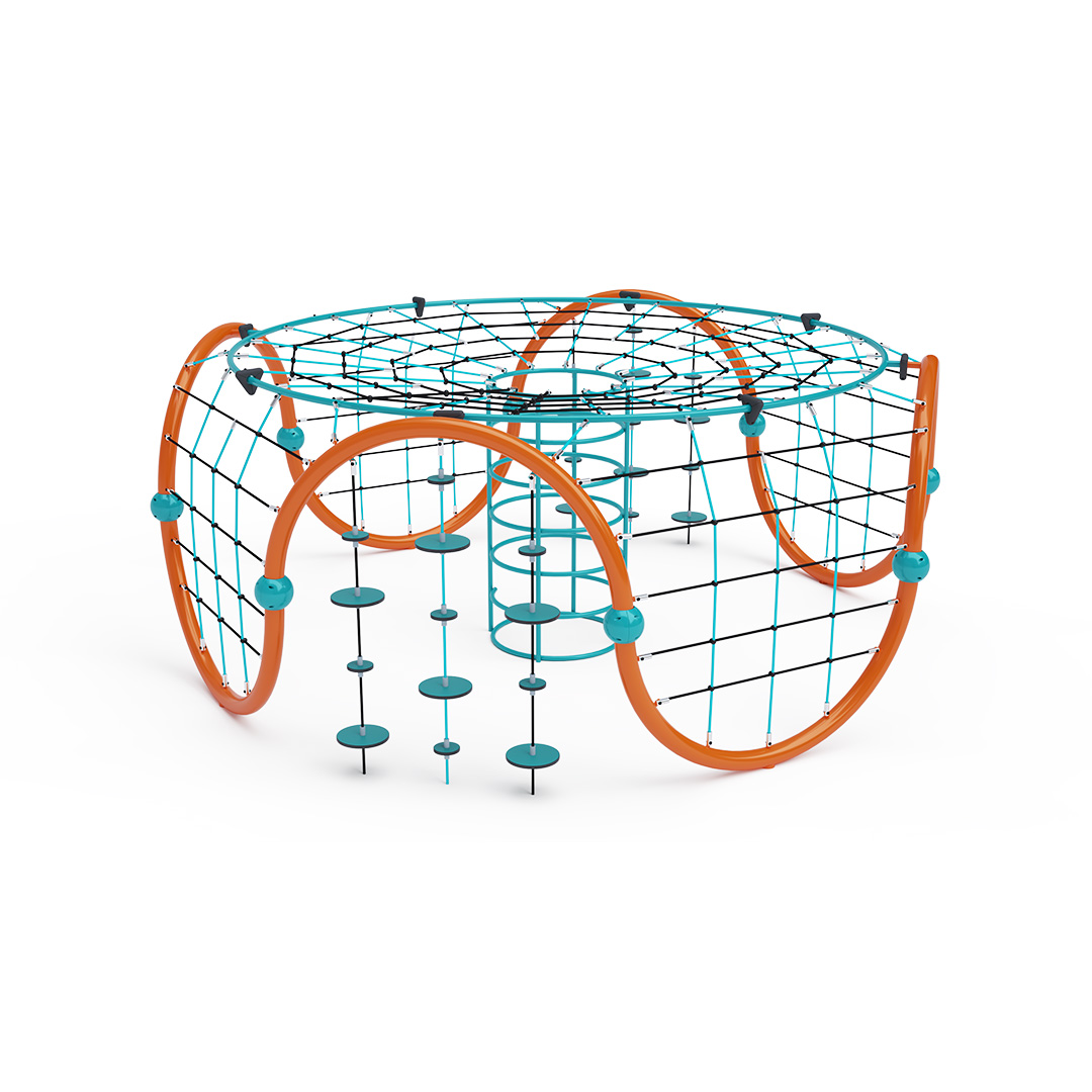 A közepes méretű tölcséres, iglu alakú kombinált kötélmászóka tartószerkezete horganyzott és porszórt acélból, kötélrendszere pedig acélmagos poliészter kötélből készül. A poliészter szálakból készült acélmagos kötél magas szilárdsággal bír, és ezáltal jobban ellenáll a mechanikai igénybevételnek. Maga a poliészter számos pozitív tulajdonsággal rendelkezik. Színtartó, ellenáll a mikroorganizmusoknak, az időjárási hatásoknak (pl. eső után gyorsan szárad). Minden kötőelem rozsdamentes acélból készül, és a fokozott tartósság és biztonság érdekében műanyag kupakkal van lezárva. A használt anyagoknak köszönhetően az eszköz minimális karbantartást igényel! A játékeszközt úgy terveztük, hogy a hosszú élettartam mellett a maximális biztonságot is garantálja!