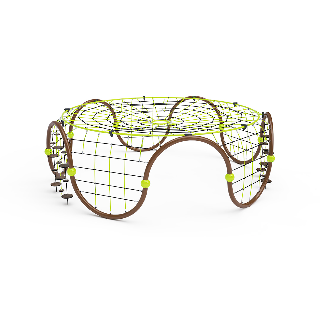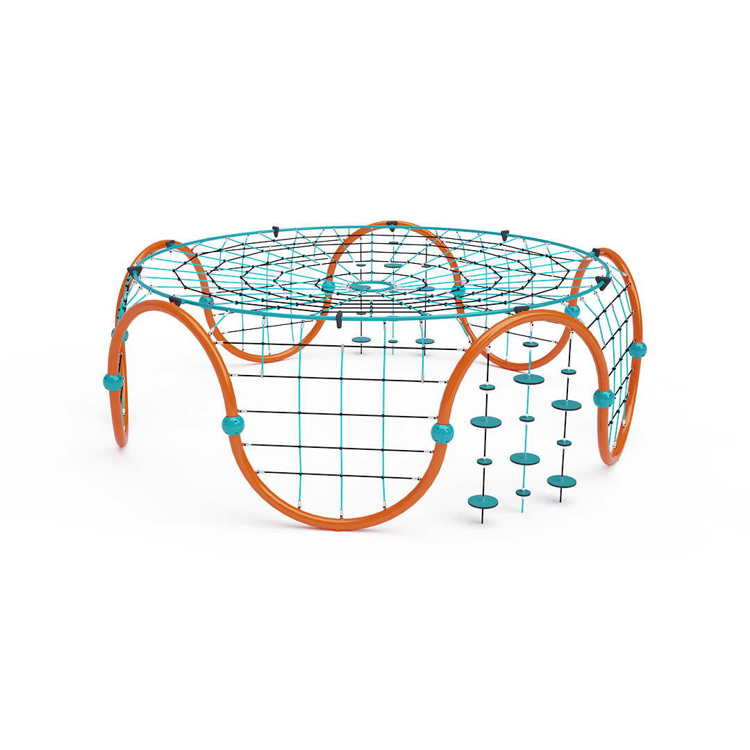 A nagyméretű iglu alakú kombinált kötélmászóka tartószerkezete horganyzott és porszórt acélból, kötélrendszere pedig acélmagos poliészter kötélből készül. A poliészter szálakból készült acélmagos kötél magas szilárdsággal bír, és ezáltal jobban ellenáll a mechanikai igénybevételnek. Maga a poliészter számos pozitív tulajdonsággal rendelkezik. Színtartó, ellenáll a mikroorganizmusoknak, az időjárási hatásoknak (pl. eső után gyorsan szárad). Minden kötőelem rozsdamentes acélból készül, és a fokozott tartósság és biztonság érdekében műanyag kupakkal van lezárva. A használt anyagoknak köszönhetően az eszköz minimális karbantartást igényel! A játékeszközt úgy terveztük, hogy a hosszú élettartam mellett a maximális biztonságot is garantálja!