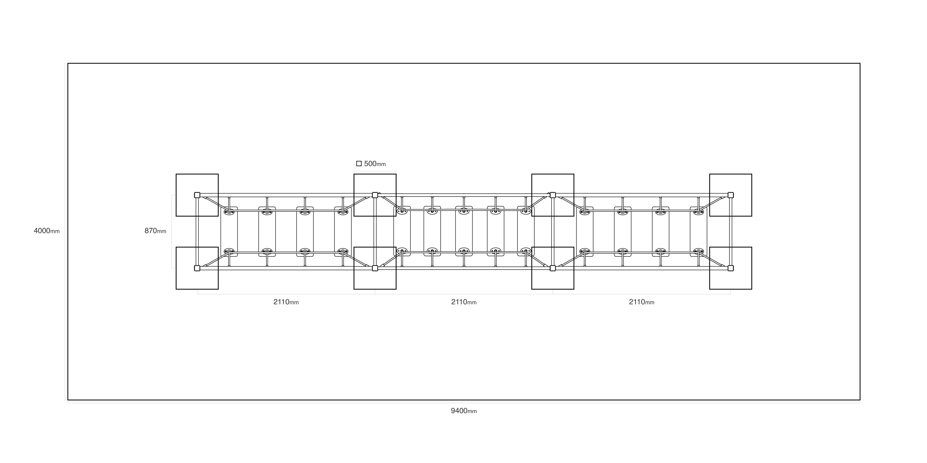 - Biztonsági zóna: 9,4 × 4,0 m