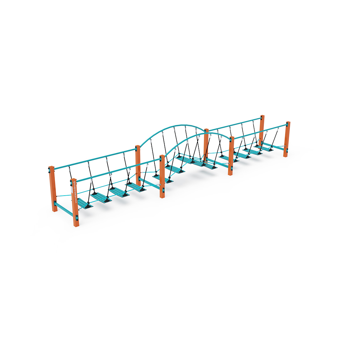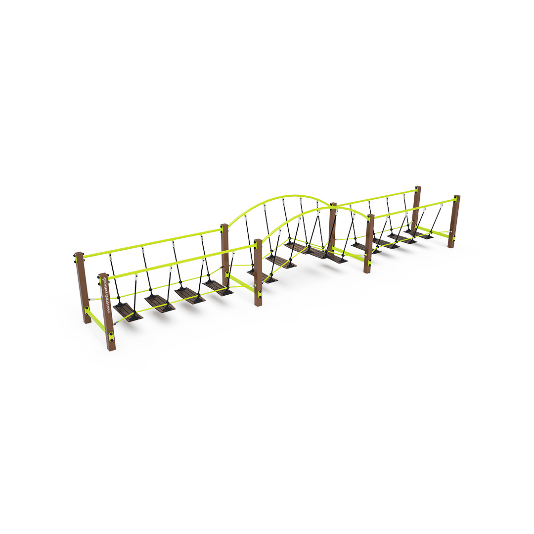 A három részből álló, lépegető lapokkal ellátott kötélhíd szerkezete acélból, lépegetőlapjai csúszásmentes HPL jelölésű magas nyomású laminált kompaktlemezből és kötélrendszere pedig acélmagos poliészter kötélből készül. A magas nyomású HPL lemez törhetetlen, nem mérgező, újrahasznosítható, továbbá vegyszer- és UV-álló, így nem áll fenn annak a veszélye, hogy a gyermekek megsérülnek a játszás közben.készül. Az acél szerkezet horgany és KOMAXIT égetett porfesték felületkezelést kap. A poliészter szálakból készült acélmagos kötél magas szilárdsággal bír és ez által jobban ellenáll a mechanikai igénybevételnek. Maga a poliészter számos pozitív tulajdonsággal rendelkezik. Színtartó, ellenáll a mikroorganizmusoknak, az időjárási hatásoknak, (pl. eső után gyorsan szárad). Ezeknek az anyagoknak köszönhetően az eszköz minimális karbantartást igényel! A játékeszközt úgy terveztük, hogy a hosszú élettartam mellett a maximális biztonságot is garantálja! A kötélhíd ideális játékeszköz a kisebb gyermekek szórakoztatására! A kötélhídon a gyermekek a stabilitást és a koordinációt gyakorolhatják.