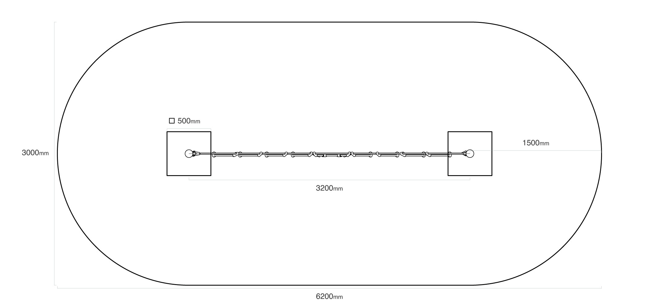 - Biztonsági zóna: 6,2 × 3,0 m