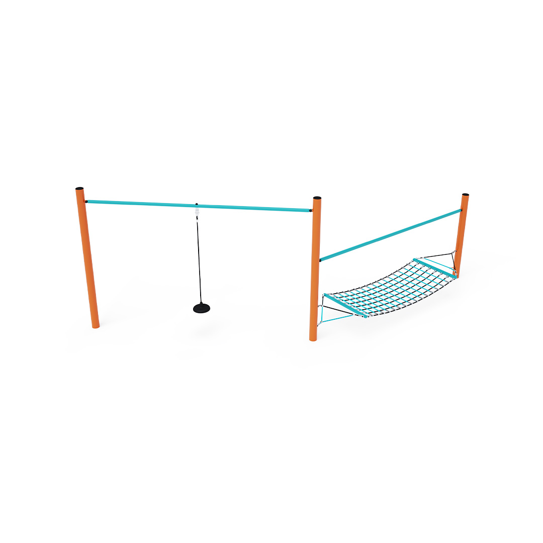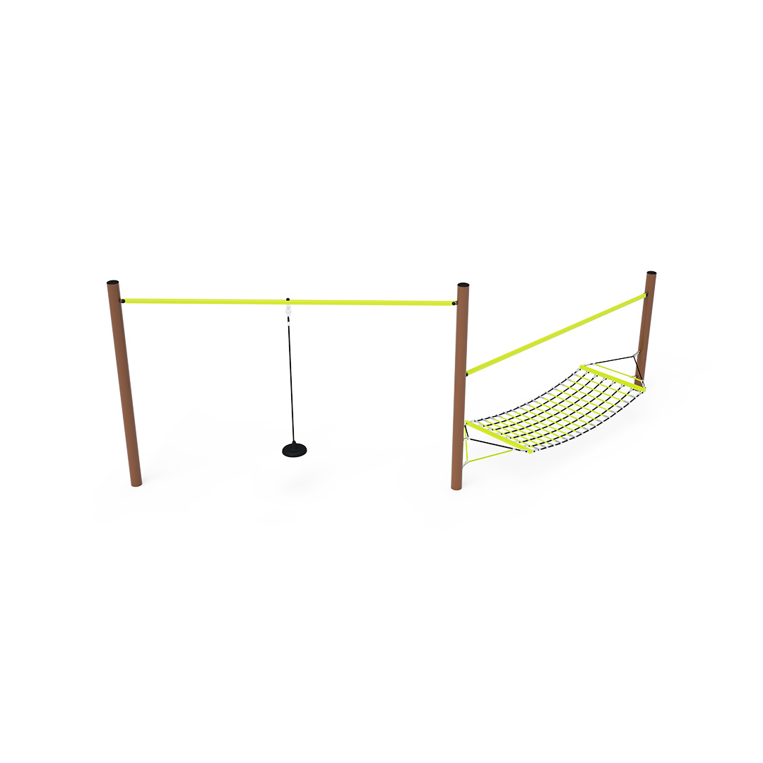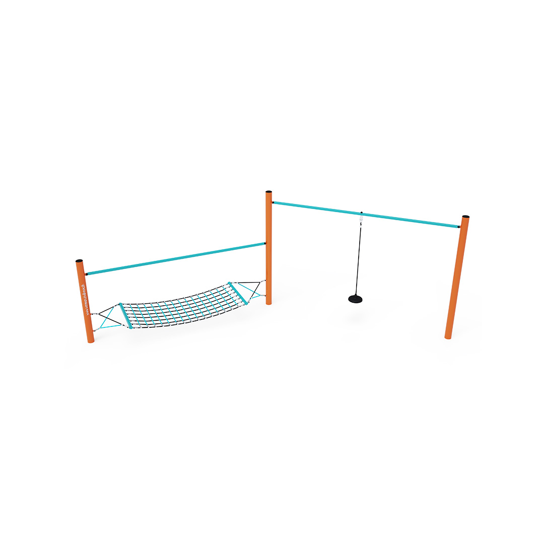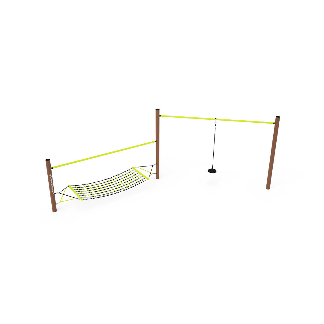 Két rész kombinálásával létrehozott majompálya. Egyik része alkalmas egyensúlyozásra vagy pihenésre alkalmas. A másik rész egy szabadon felfüggesztett kötél, széles véggel - egyszerű, mégis nagyon sokoldalú elem. A játékelem horganyzott acélból készül, kiváló minőségű kivitelben, az illesztések anyaga rozsdamentes acél, és műanyag fedelekkel vannak letakarva a nagyobb biztonság és az illesztések tartóssága érdekében. A kötelek poliészterszálakból készülnek, amelyek a középpont köré vannak tekerve. Ez a fajta kötélszerkezet növeli a kötelek szilárdságát és ellenállóságát a mechanikai igénybevétellel szemben. Maga a poliészter számos pozitív tulajdonsággal rendelkezik: ellenálló a mikroorganizmusokkal és az időjárás viszontagságaival szemben, eső után gyorsan szárad, színtartó és nagyfokú szilárdság jellemzi.