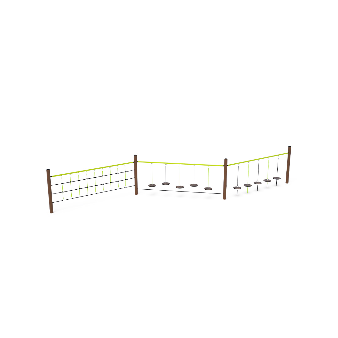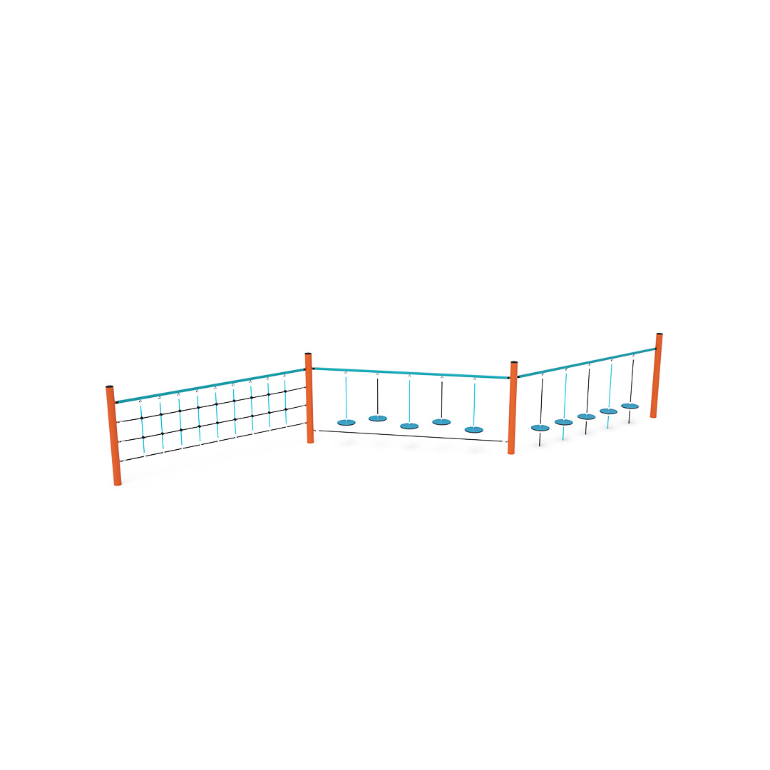 Három rész kombinálásával létrehozott majompálya. Az első rész függőlegesen lelógatott fellépőkből áll, a második rész függőleges kötélhálóval teszteli a gyermekek kezének erejét. A harmadik rész a lógó "kövekkel" a koncentrációs képességeiket, valamint az egész testük koordinációját teszi próbára. Egyáltalán nem könnyű az egyik szabadon lógó kőről átlépni a másikra. A játékelem horganyzott acélból készült, kiváló minőségű kivitelben, az illesztések anyaga rozsdamentes acél, és műanyag fedéllel borították őket, hogy növeljék az illesztések biztonságát és tartósságát. A kötelek poliészterszálakból készülnek, amelyek egy központi szem köré vannak tekerve. Ez a fajta kötélszerkezet növeli a kötél szilárdságát és a mechanikai igénybevétellel szembeni ellenállását. Maga a poliészter ellenáll a mikroorganizmusoknak, az időjárás viszontagságainak, eső után gyorsan szárad, színtartó és nagy szilárdság jellemzi.