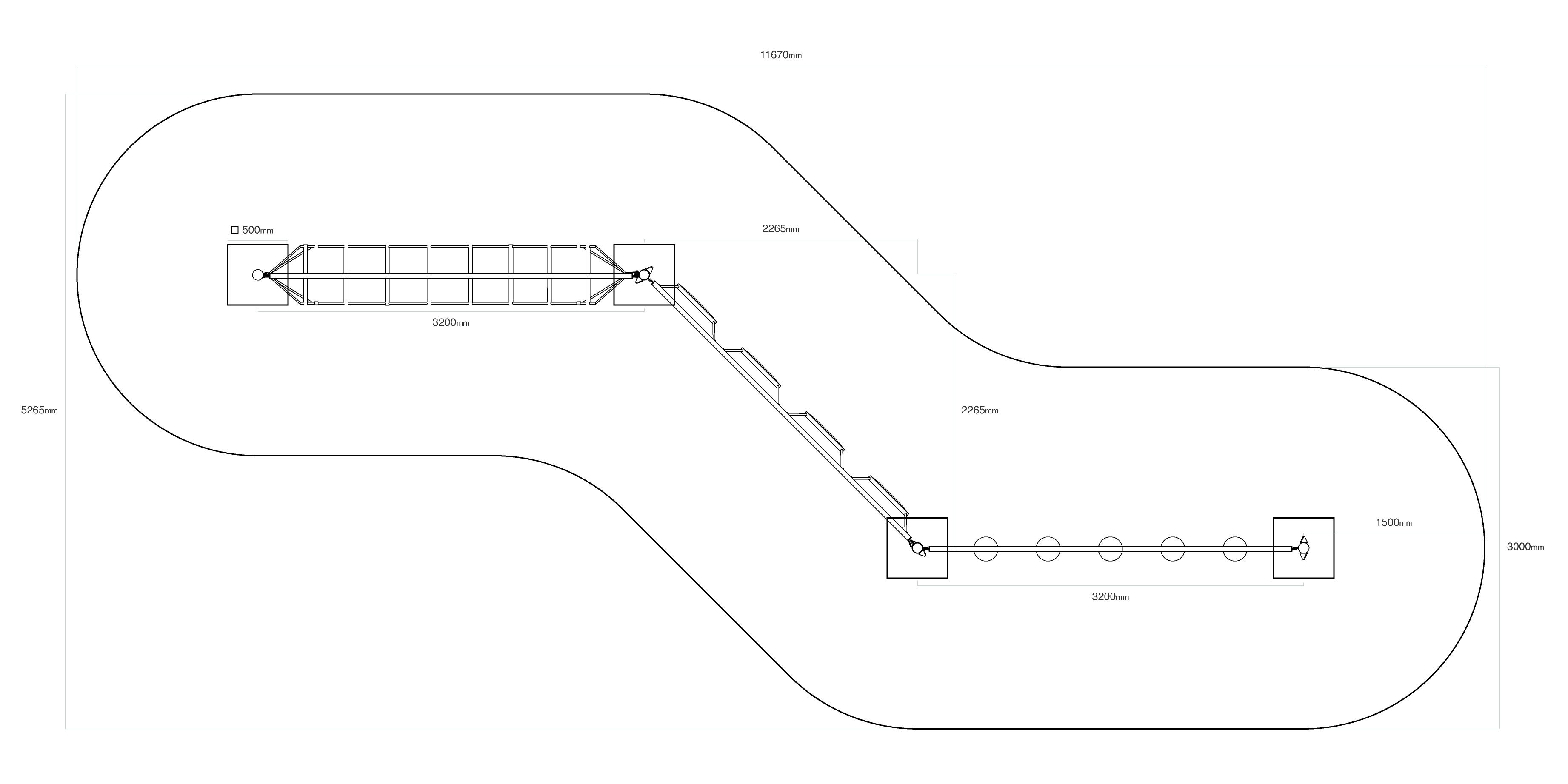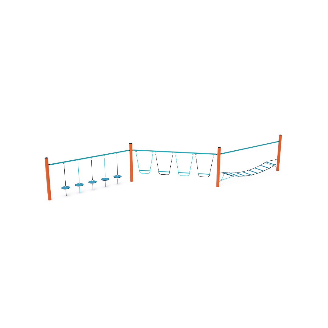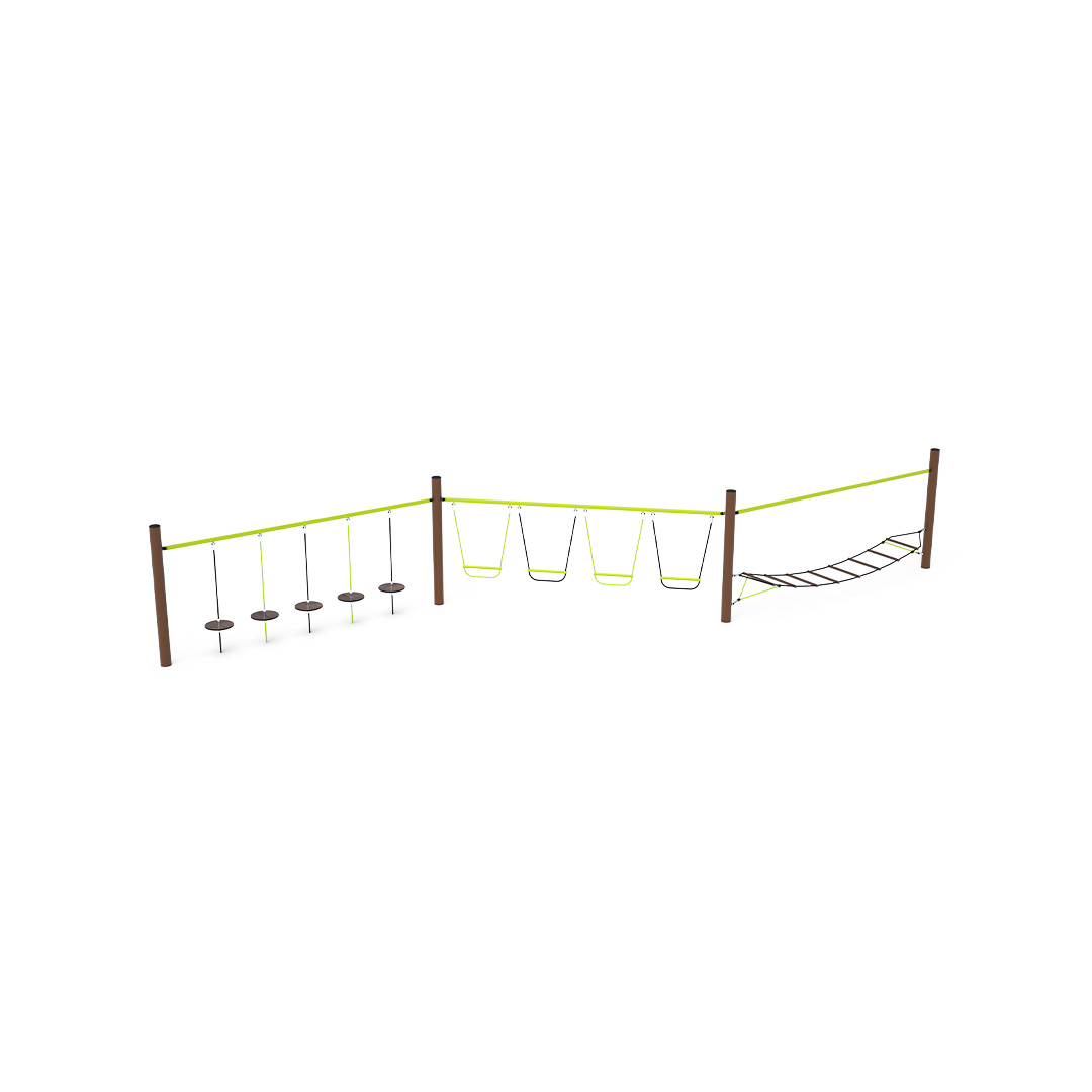 Három rész kombinálásával létrehozott majompálya. A vízszintesen "lógó" háló által létrehozott első rész a gyermekeket az ingatagságával szórakoztatja. A második részt függőlegesen lógó fellépők alkotják. A gyerekek megtapasztalják, milyen szórakoztató és fárasztó, amikor nem a szilárd talajon állnak. A "lógó kövekből" álló rész teszteli a koncentrációs képességüket és az egész testük koordinációját. A játékelem horganyzott acélból készült, kiváló minőségű kivitelben, az illesztések anyaga rozsdamentes acél, és műanyag fedéllel borították őket, hogy növeljék az illesztések biztonságát és tartósságát. A kötelek poliészterszálakból készülnek, amelyek egy központi szem köré vannak tekerve. Ez a fajta kötélszerkezet növeli a kötél szilárdságát és a mechanikai igénybevétellel szembeni ellenállását. Maga a poliészter ellenáll a mikroorganizmusoknak, az időjárás viszontagságainak, eső után gyorsan szárad, színtartó és nagy szilárdság jellemzi.