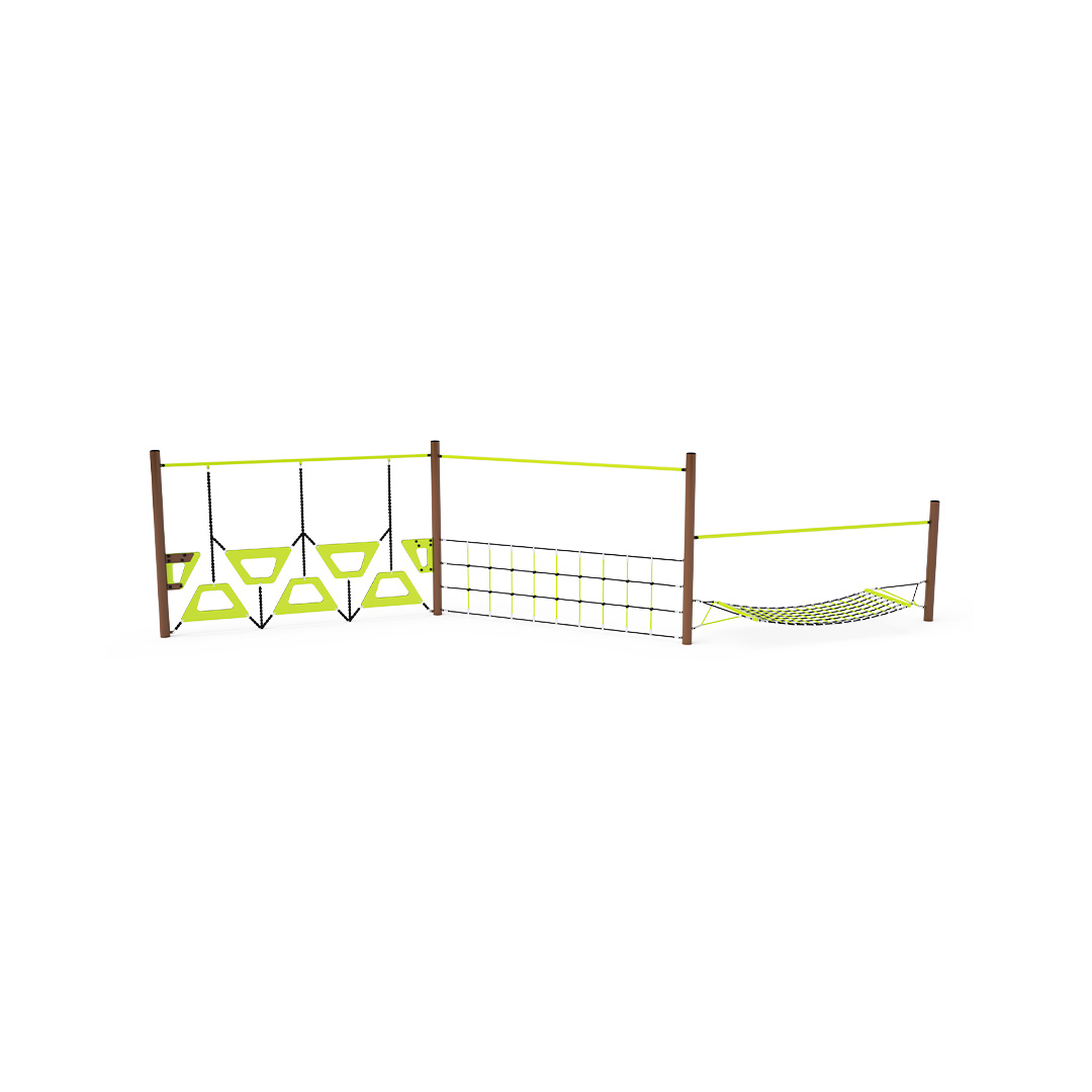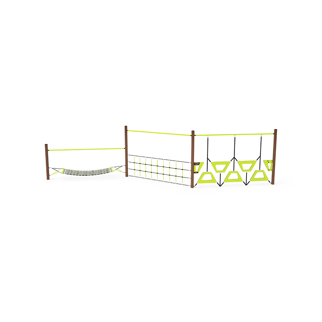 A játékelem horganyzott acélból készül, kiváló minőségű kivitelben, az illesztések anyaga rozsdamentes acél, és műanyag fedelekkel vannak letakarva a nagyobb biztonság és az illesztések tartóssága érdekében. A kötelek poliészterszálakból készülnek, amelyek a középpont köré vannak tekerve. Ez a fajta kötélszerkezet növeli a kötelek szilárdságát és ellenállóságát a mechanikai igénybevétellel szemben. Maga a poliészter számos pozitív tulajdonsággal rendelkezik: ellenálló a mikroorganizmusokkal és az időjárás viszontagságaival szemben, eső után gyorsan szárad, színtartó és nagyfokú szilárdság jellemzi.