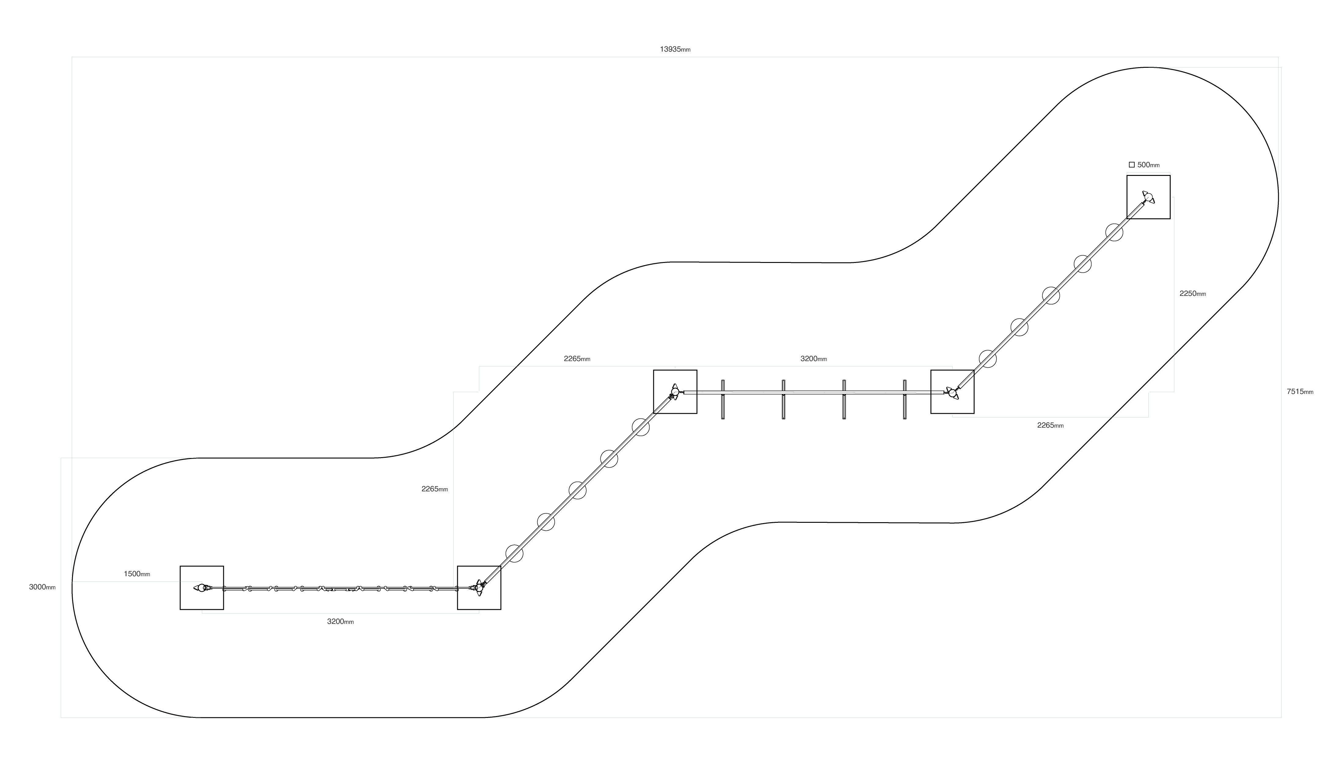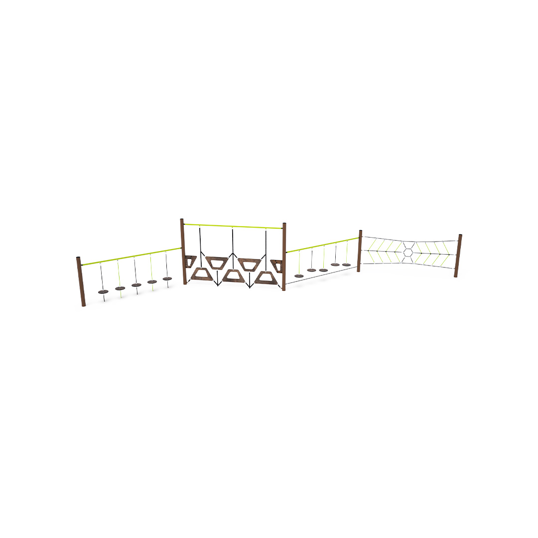 Négy rész kombinálásával létrehozott majompálya: két rész különböző magasságban, de egy vonalban "lógó kövekkel", egy rész szabadon egymás mellett lógó fellépőkkel és egy függőleges kötélpókhálóból kialakított rész. A játékelem horganyzott acélból készül, kiváló minőségű kivitelben, az illesztések anyaga rozsdamentes acél, és műanyag fedelekkel vannak letakarva a nagyobb biztonság és az illesztések tartóssága érdekében. A kötelek poliészterszálakból készülnek, amelyek a középpont köré vannak tekerve. Ez a fajta kötélszerkezet növeli a kötelek szilárdságát és ellenállóságát a mechanikai igénybevétellel szemben. Maga a poliészter számos pozitív tulajdonsággal rendelkezik: ellenálló a mikroorganizmusokkal és az időjárás viszontagságaival szemben, eső után gyorsan szárad, színtartó és nagyfokú szilárdság jellemzi.
