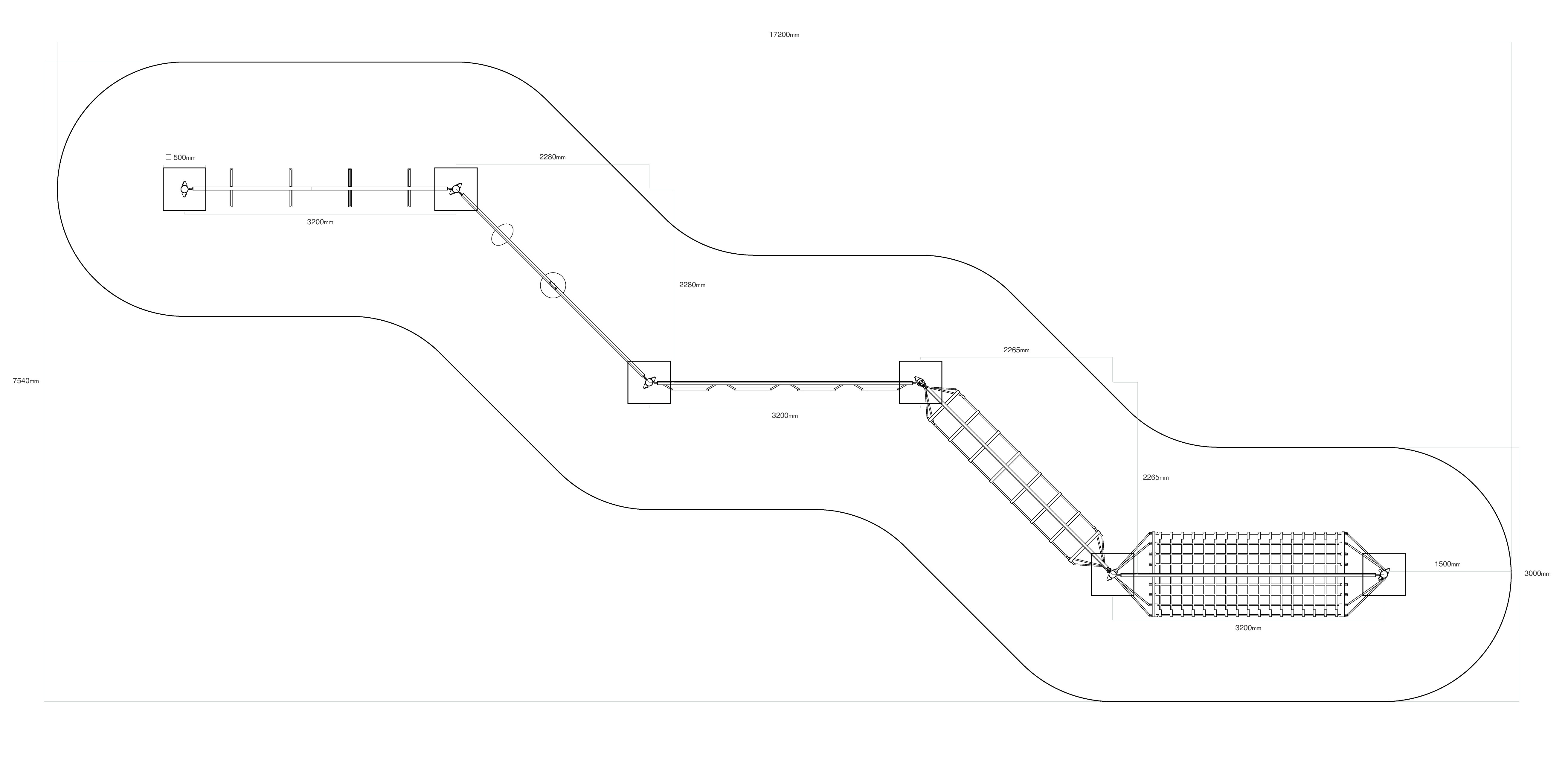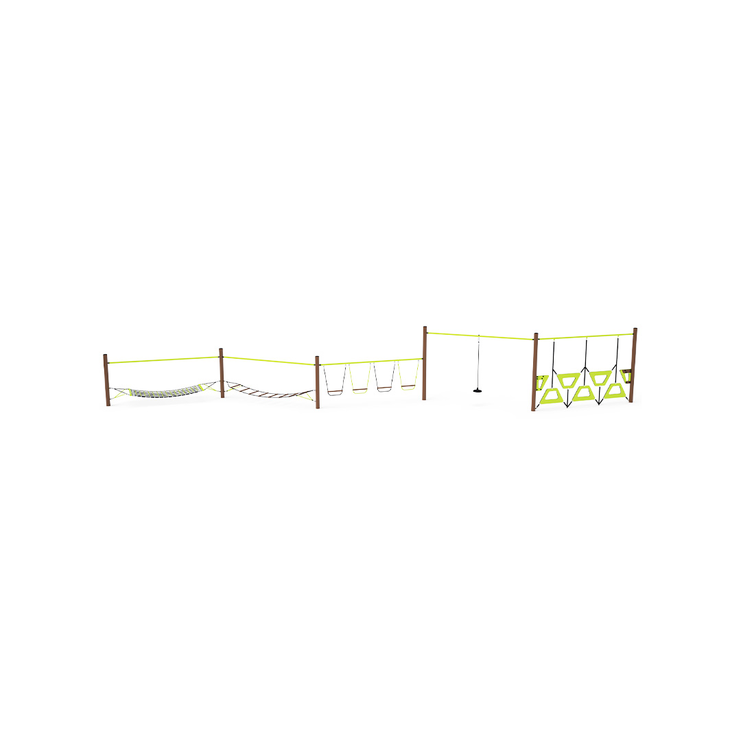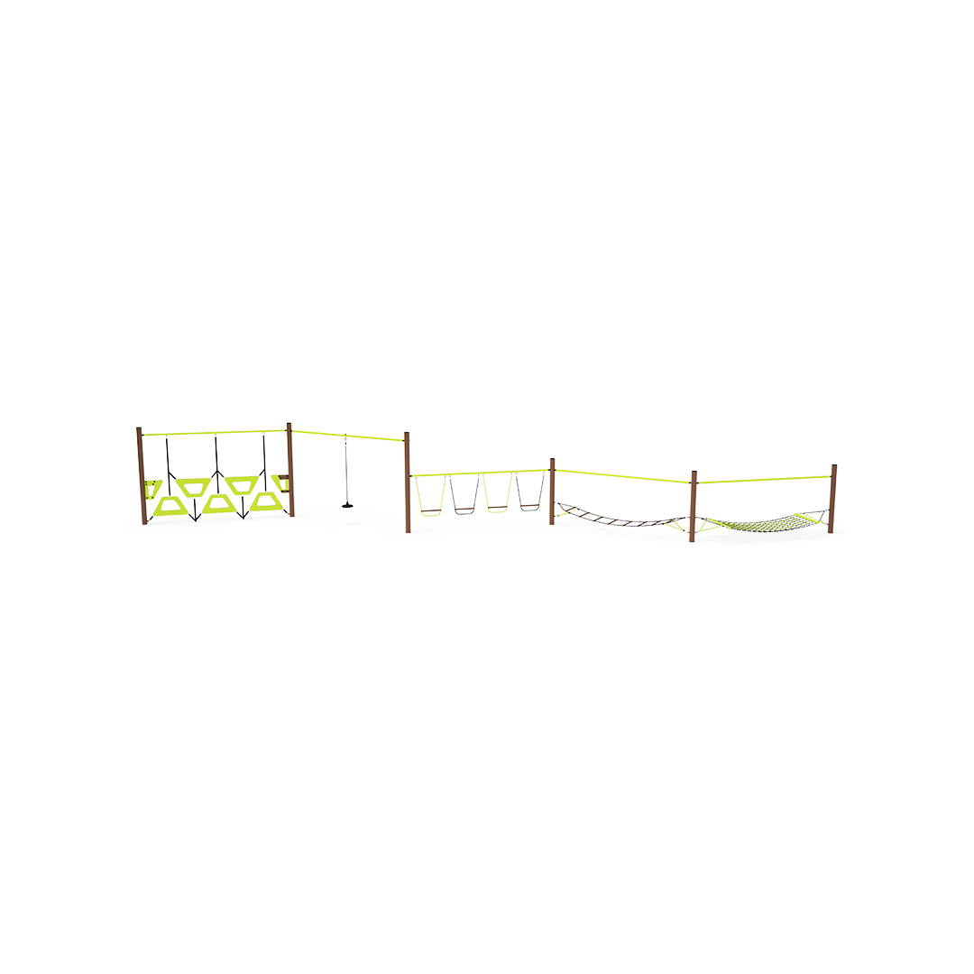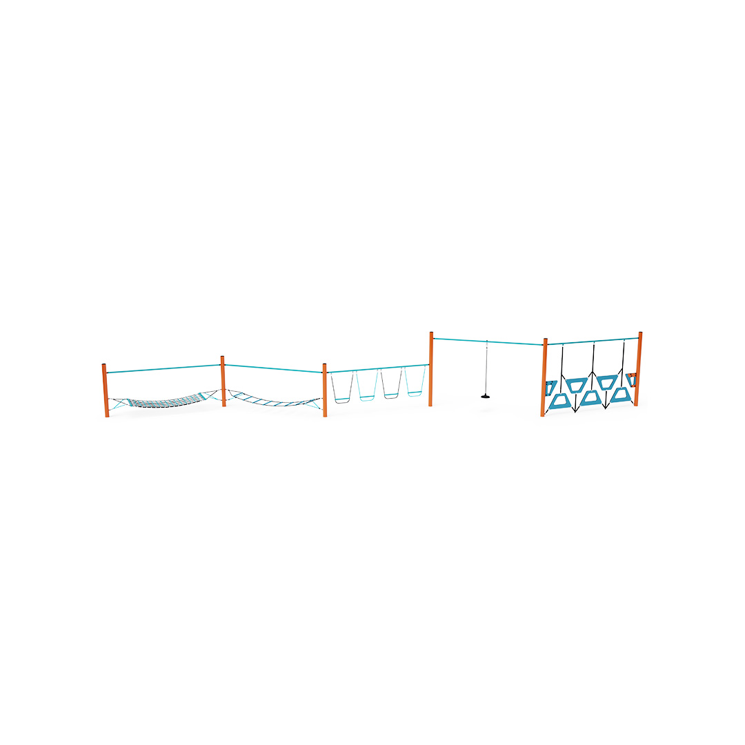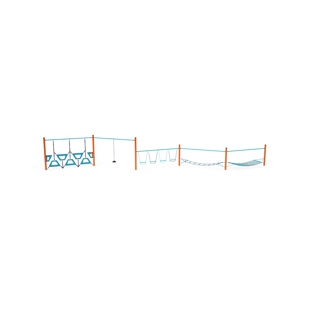 Öt rész kombinálásával létrehozott majompálya: szabadon lógó lépegetőfokok, szabadon lógó kötél, lógó és hintázó lépegetőfokok, egyensúlyozó létra és kötélháló. A játékelem horganyzott acélból készül, kiváló minőségű kivitelben, az illesztések anyaga rozsdamentes acél, és műanyag fedelekkel vannak letakarva a nagyobb biztonság és az illesztések tartóssága érdekében. A kötelek poliészterszálakból készülnek, amelyek a középpont köré vannak tekerve. Ez a fajta kötélszerkezet növeli a kötelek szilárdságát és ellenállóságát a mechanikai igénybevétellel szemben. Maga a poliészter számos pozitív tulajdonsággal rendelkezik: ellenálló a mikroorganizmusokkal és az időjárás viszontagságaival szemben, eső után gyorsan szárad, színtartó és nagyfokú szilárdság jellemzi.