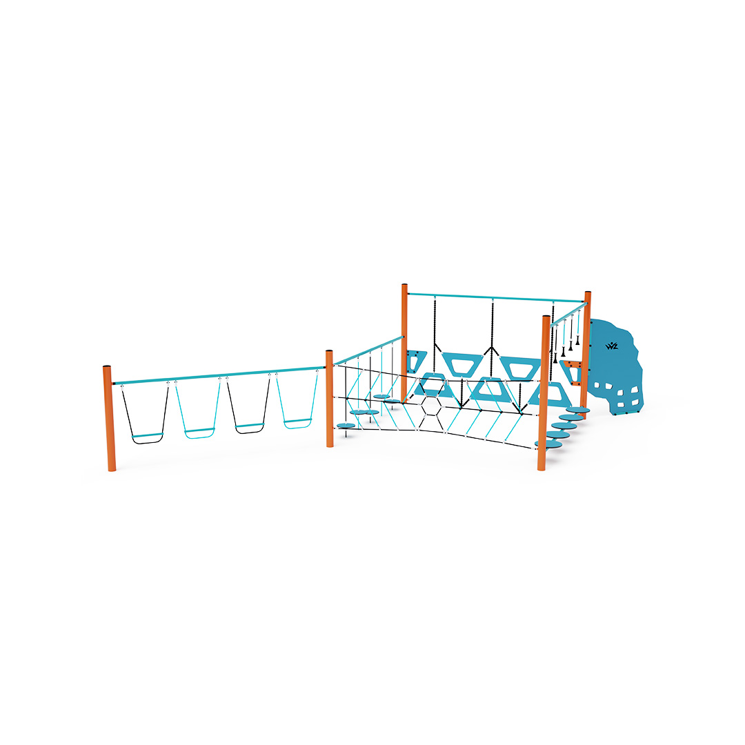 Hat részből álló mászóka: HPL egyensúlyozó lépcsők függőleges segédkötelekkel, trapézfal, függő egyensúlyozó kövek, függőleges pókháló, függőlegesen felfüggesztett lépcsők és egy mini mászófal. A játékelem horganyzott acélból készült, kiváló minőségű felületkezeléssel - porfestéssel, az illesztések rozsdamentes acélból készültek és műanyag kupakokkal vannak bevonva az illesztések biztonságának és tartósságának növelése érdekében. A kötelek poliészter szálakból készülnek, acélmaggal, amelyek a középpont köré vannak tekercselve. Ez a kötélszerkezet növeli a szilárdságát és a mechanikai igénybevétellel szembeni ellenállását. Maga a poliészter is számos pozitív tulajdonsággal rendelkezik. Ellenáll a mikroorganizmusoknak, az időjárás viszontagságainak, eső után gyorsan szárad, színtartó és nagy szilárdságú.