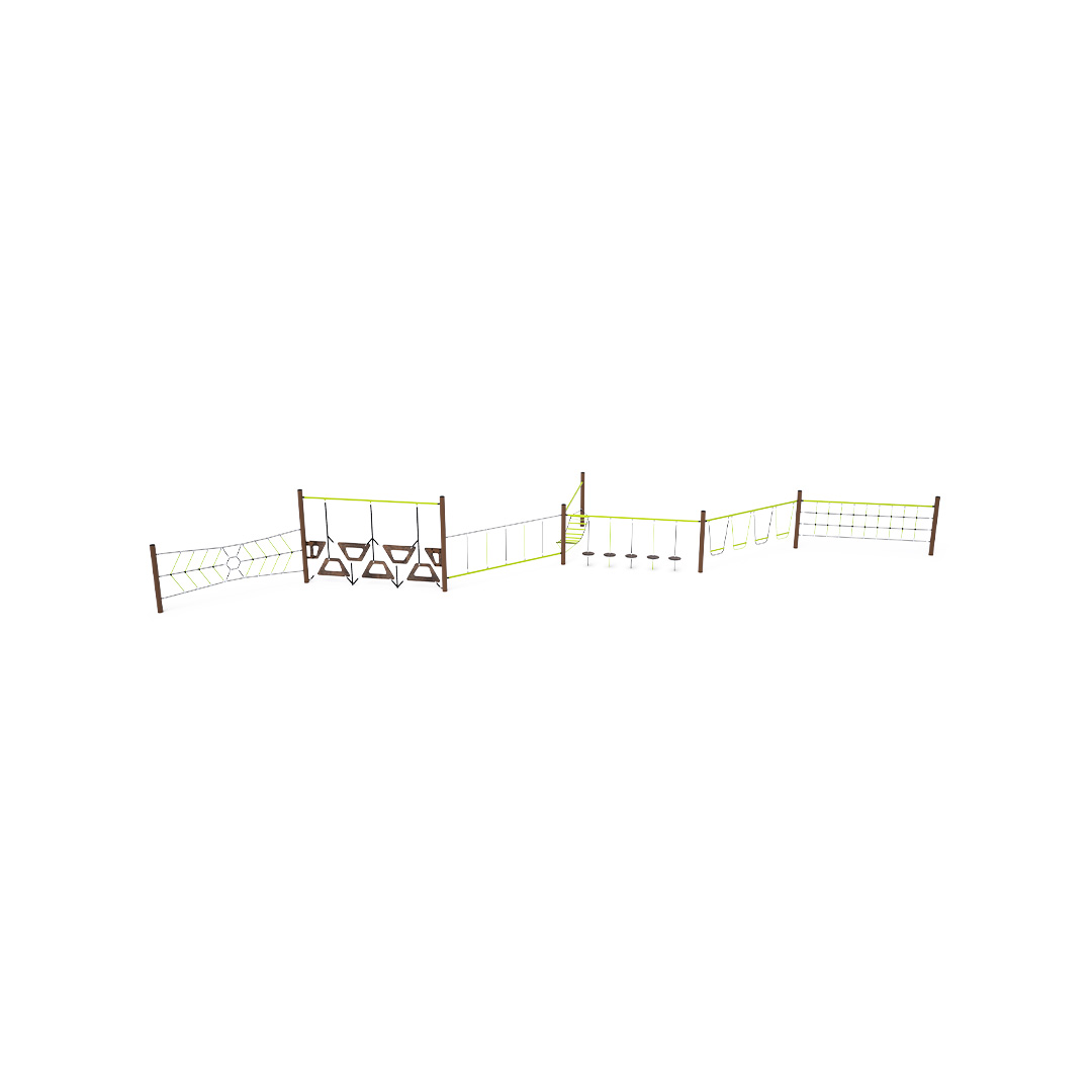 Hét rész kombinálásával létrehozott majompálya: kötélháló, függőlegesen felakasztott fellépők, függő egyensúlyozókövek, vízszintes háló fellépőkkel, csimpaszkodószakasz, szabadon lógó fellépők és pókháló. A játékelem horganyzott acélból készül, kiváló minőségű felületi kezeléssel, az illesztések anyaga rozsdamentes acél, és műanyag fedelekkel vannak letakarva a nagyobb biztonság és az illesztések tartóssága érdekében. A kötelek poliészterszálakból készülnek, amelyek a középpont köré vannak tekerve. Ez a fajta kötélszerkezet növeli a kötelek szilárdságát és ellenállóságát a mechanikai igénybevétellel szemben. Maga a poliészter számos pozitív tulajdonsággal rendelkezik: ellenálló a mikroorganizmusokkal és az időjárás viszontagságaival szemben, eső után gyorsan szárad, színtartó és nagyfokú szilárdság jellemzi.