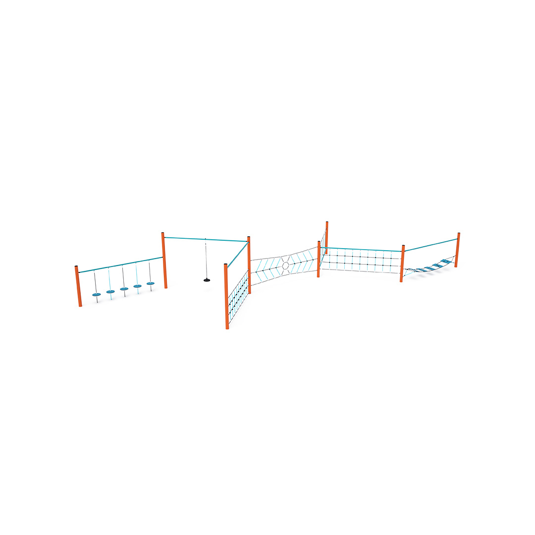 Hét rész kombinálásával létrehozott majompálya: egyensúlyozó kövek, szabadon lógó kötél, függőleges kötélháló, pókháló, egyensúlyozó rúd, függőleges kötélháló segédrúddal és oktató jellegű egyensúlyozó fellépők. A játékelem horganyzott acélból készül, kiváló minőségű kivitelben, az illesztések anyaga rozsdamentes acél, és műanyag fedelekkel vannak letakarva a nagyobb biztonság és az illesztések tartóssága érdekében. A kötelek poliészterszálakból készülnek, amelyek a középpont köré vannak tekerve. Ez a fajta kötélszerkezet növeli a kötelek szilárdságát és ellenállóságát a mechanikai igénybevétellel szemben. Maga a poliészter számos pozitív tulajdonsággal rendelkezik: ellenálló a mikroorganizmusokkal és az időjárás viszontagságaival szemben, eső után gyorsan szárad, színtartó és nagyfokú szilárdság jellemzi.