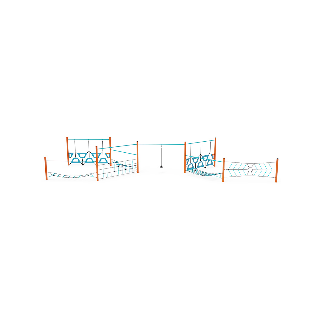 Nyolc rész kombinálásával létrehozott majompálya: pókháló, hintaháló, szabadon lógó fogantyúk, szabadon lógó kötél, függőleges háló segédrúddal, egyensúlyi létra és oktató jellegű egyensúlyozó fellépők. A játékelem horganyzott acélból készül, kiváló minőségű kivitelben, az illesztések anyaga rozsdamentes acél, és műanyag fedelekkel vannak letakarva a nagyobb biztonság és az illesztések tartóssága érdekében. A kötelek poliészterszálakból készülnek, amelyek a középpont köré vannak tekerve. Ez a fajta kötélszerkezet növeli a kötelek szilárdságát és ellenállóságát a mechanikai igénybevétellel szemben. Maga a poliészter számos pozitív tulajdonsággal rendelkezik: ellenálló a mikroorganizmusokkal és az időjárás viszontagságaival szemben, eső után gyorsan szárad, színtartó és nagyfokú szilárdság jellemzi.