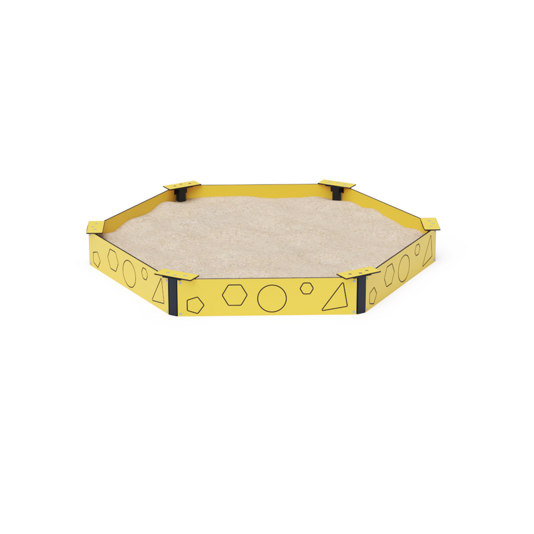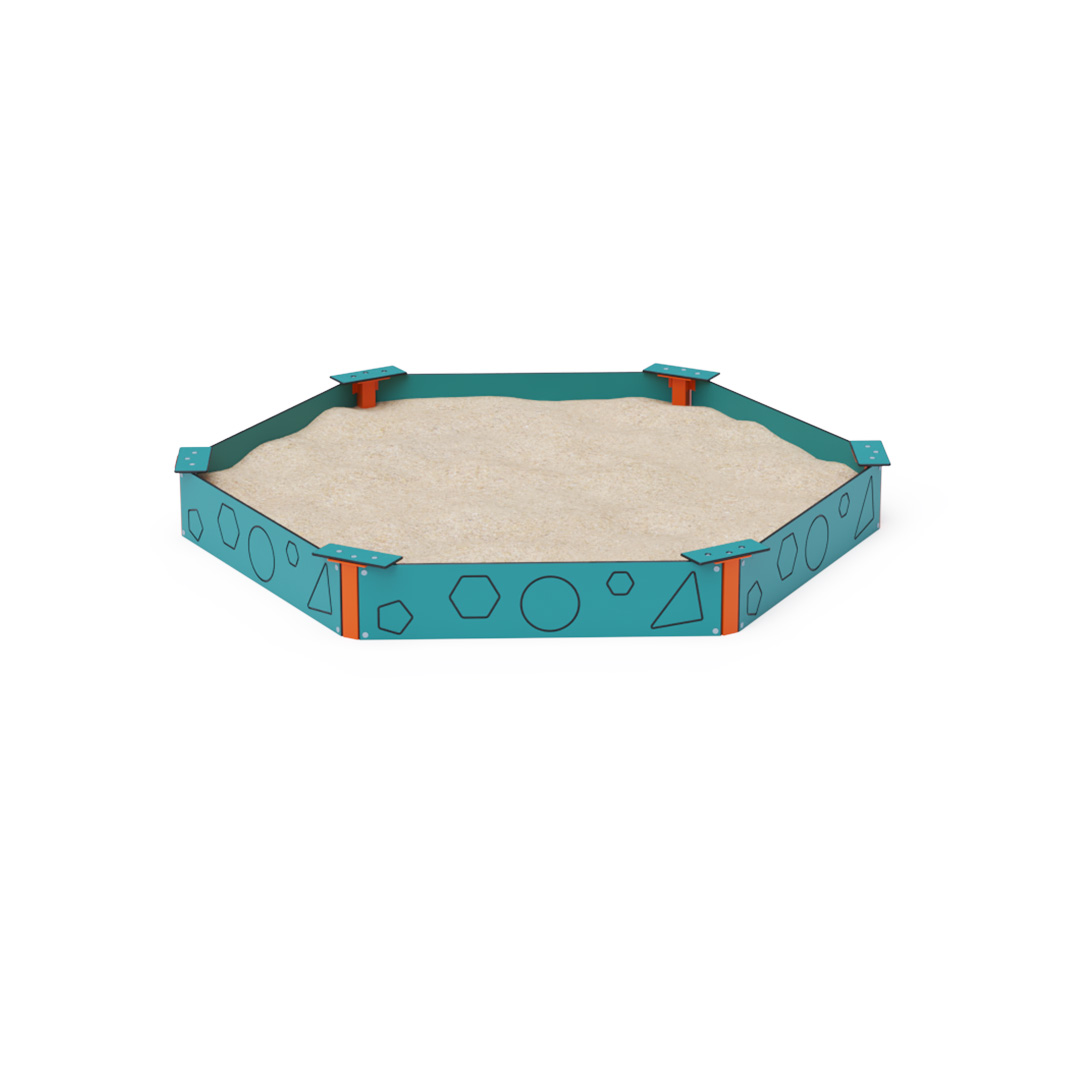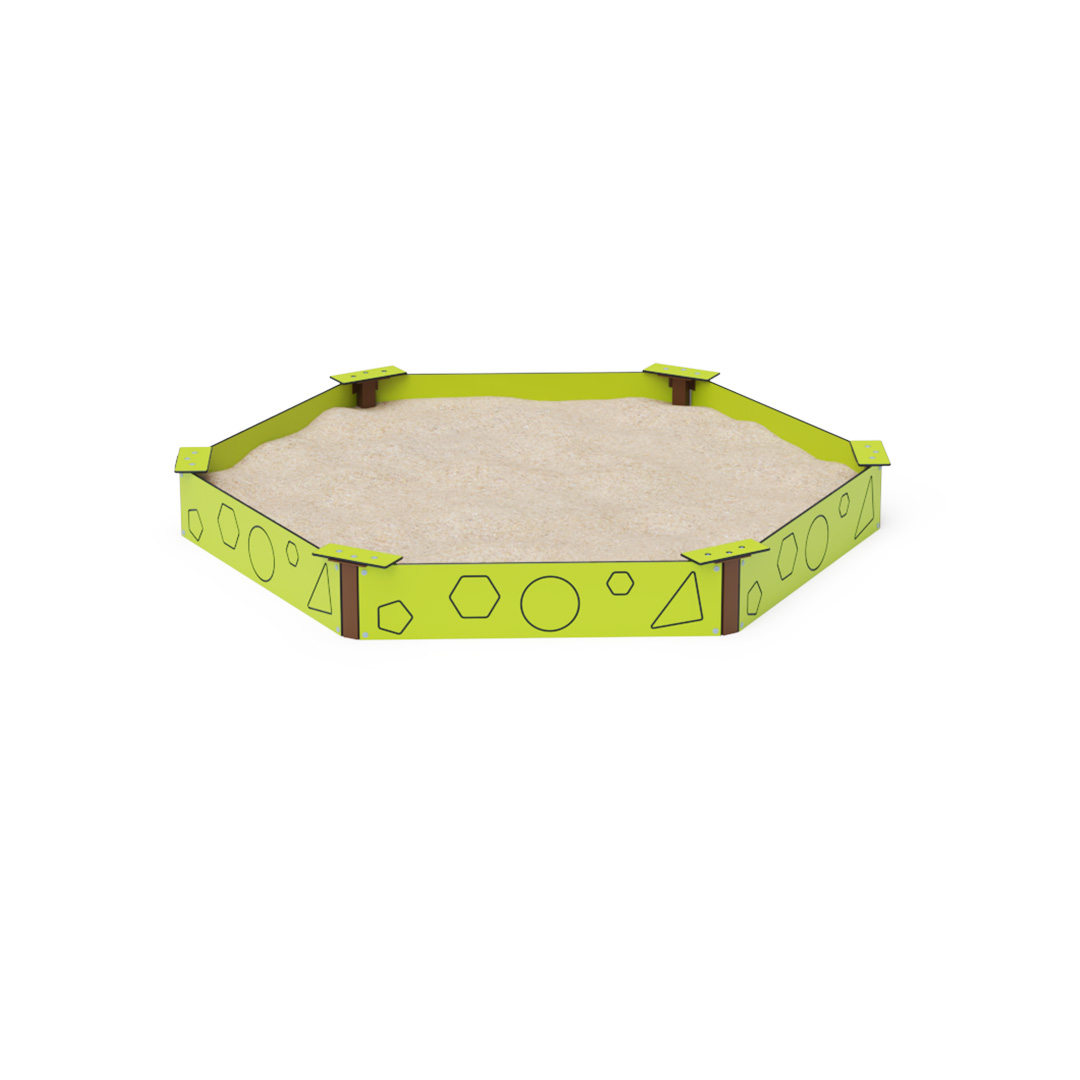 A geometriai alakzatokat ábrázoló ülőkékkel felszerelt hatszög alakú homokozó szerkezete horganyzott és porszórt acélból, kötőelemei rozsdamentes acélból, ülőkéi és lapjai pedig HPL jelölésű magas nyomású laminált kompaktlemezből készülnek. A magas nyomású HPL lemez törhetetlen, nem mérgező, újrahasznosítható, továbbá vegyszer- és UV álló. A használt anyagoknak köszönhetően az eszköz minimális karbantartást igényel! A játékeszközt úgy terveztük, hogy a hosszú élettartam mellett a maximális biztonságot is garantálja!