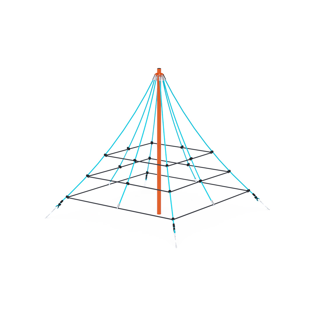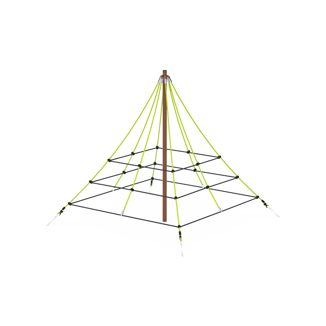 Az 1 méter magas kötélpiramis tartó oszlopa horganyzott és porszórt acélból, kötélrendszere pedig acélmagos poliészter kötélből készül. A poliészter szálakból készült acélmagos kötél magas szilárdsággal bír és ez által jobban ellenáll a mechanikai igénybevételnek. Maga a poliészter számos pozitív tulajdonsággal rendelkezik. Színtartó, ellenáll a mikroorganizmusoknak, az időjárási hatásoknak, (pl. eső után gyorsan szárad). Ezeknek az anyagoknak köszönhetően az eszköz minimális karbantartást igényel! A játékeszközt úgy terveztük, hogy a hosszú élettartam mellett a maximális biztonságot is garantálja!