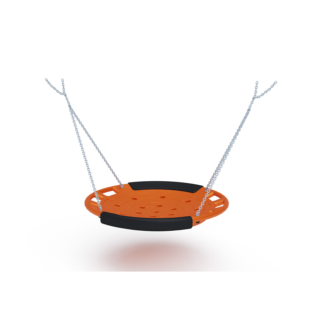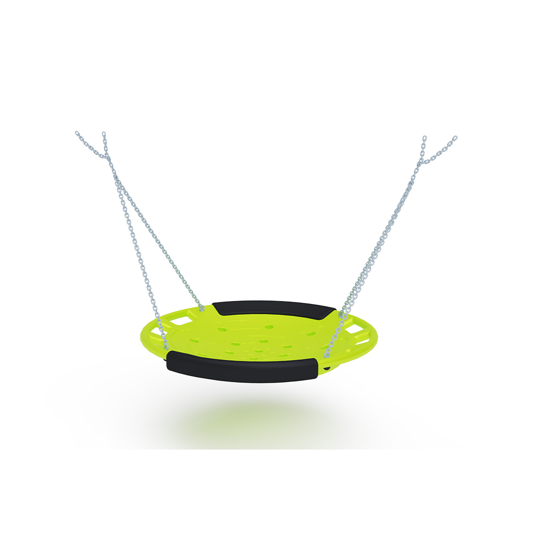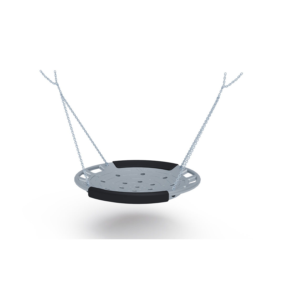 A VVZ-S-H fészekhinta kosár modern megjelenésével és tartós kialakításával ideális választás közterületi játszóterekhez, valamint óvodák és iskolák játszótereihez. A nagy méretű, ergonomikus kialakítású ülőfelület több gyermek számára is kényelmes és biztonságos játékélményt biztosít. A 120 cm átmérőjű kosár stabil és tágas felületet kínál, amely kiválóan alkalmas intenzív használatra. Az ülőfelület nagy szilárdságú LDPE műanyagból készül, amely ellenáll az időjárási hatásoknak, UV-sugárzásnak és a mindennapos igénybevételnek. A kosár peremén elhelyezett PE gumiütközők extra védelmet és kényelmet biztosítanak, miközben növelik a termék biztonságát használat közben. A modell három különböző színben érhető el, így könnyen illeszthető különböző játszótéri koncepciókhoz és designokhoz.
