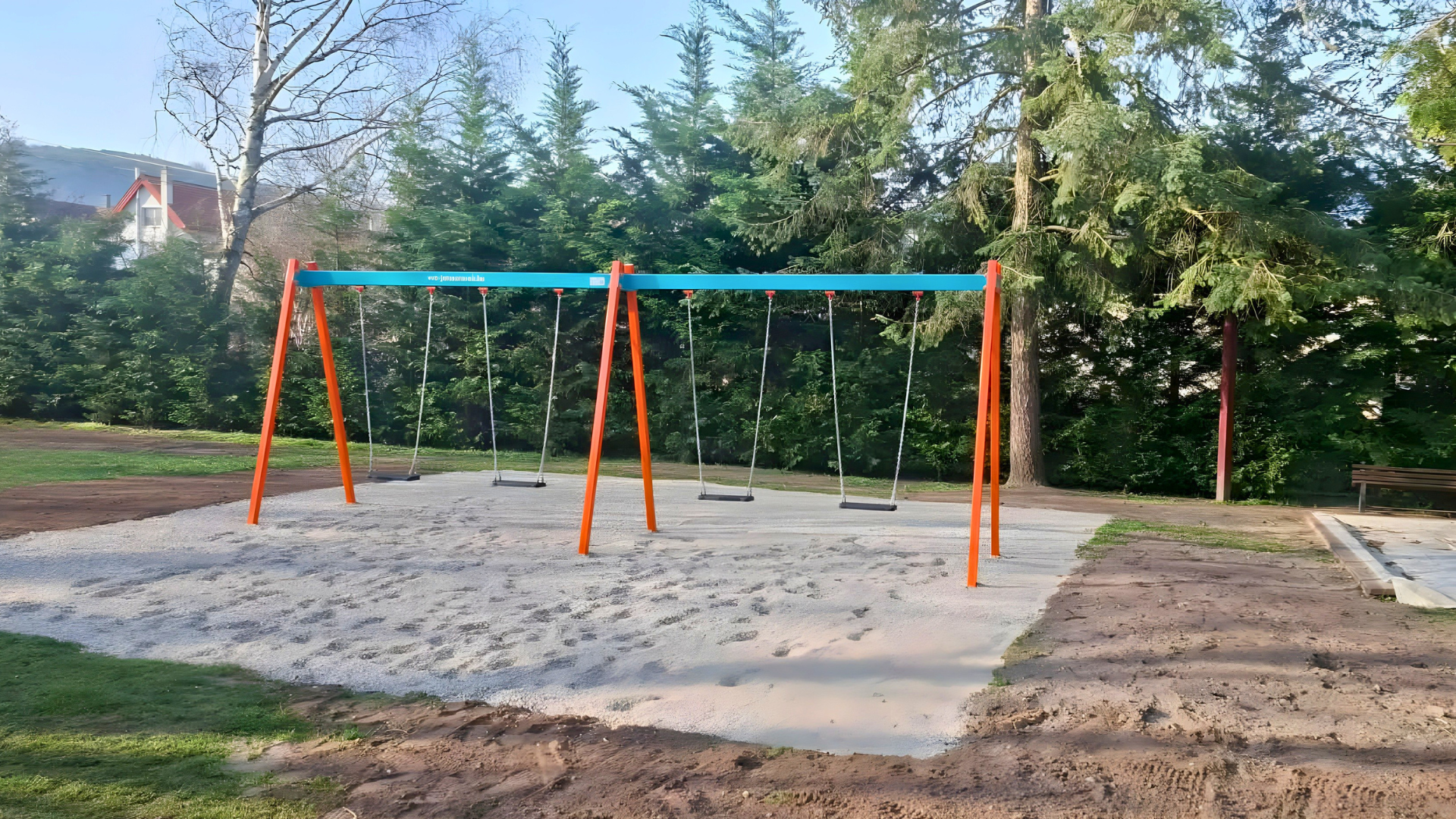 - Ütéscsillapító megoldások: gyöngykavics és folyami homok 300 mm rétegvastagságban, gyeprács, gumitégla vagy öntött gumiburkolat