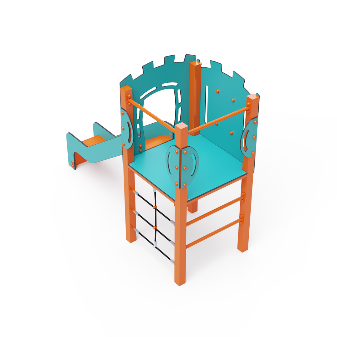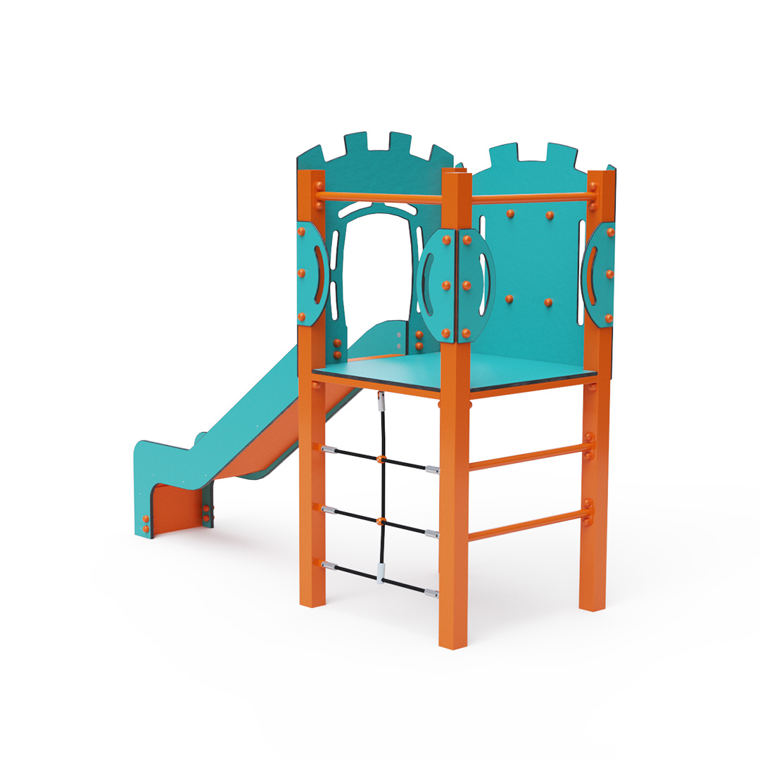 Az egytornyú játszóvár tartó szerkezete horganyzott és porszórt acélból, padlója és a mellvédek HPL jelölésű magas nyomású laminált kompaktlemezből, kötélrendszere acélmagos poliészter kötélből, csúszdája pedig HDPE műanyag és HPL kompaktlemez kombinációjából készül. A magas nyomású HPL lemez törhetetlen, nem mérgező, újrahasznosítható, továbbá vegyszer- és UV álló. A poliészter szálakból készült acélmagos kötél magas szilárdsággal bír és ezáltal jobban ellenáll a mechanikai igénybevételnek. Maga a poliészter számos pozitív tulajdonsággal rendelkezik. Színtartó, ellenáll a mikroorganizmusoknak, az időjárási hatásoknak, (pl. eső után gyorsan szárad). A HDPE jelölésű, nagy sűrűségű polietilén lapokat főként magas szilárdságuk, szívósságuk és nedvességállóságuk jellemzik. Minden kötőelem rozsdamentes acélból készül és a fokozott tartósság és biztonság érdekében műanyag kupakkal van lezárva. A használt anyagoknak köszönhetően az eszköz minimális karbantartást igényel! A játékeszközt úgy terveztük, hogy a hosszú élettartam mellett a maximális biztonságot is garantálja!